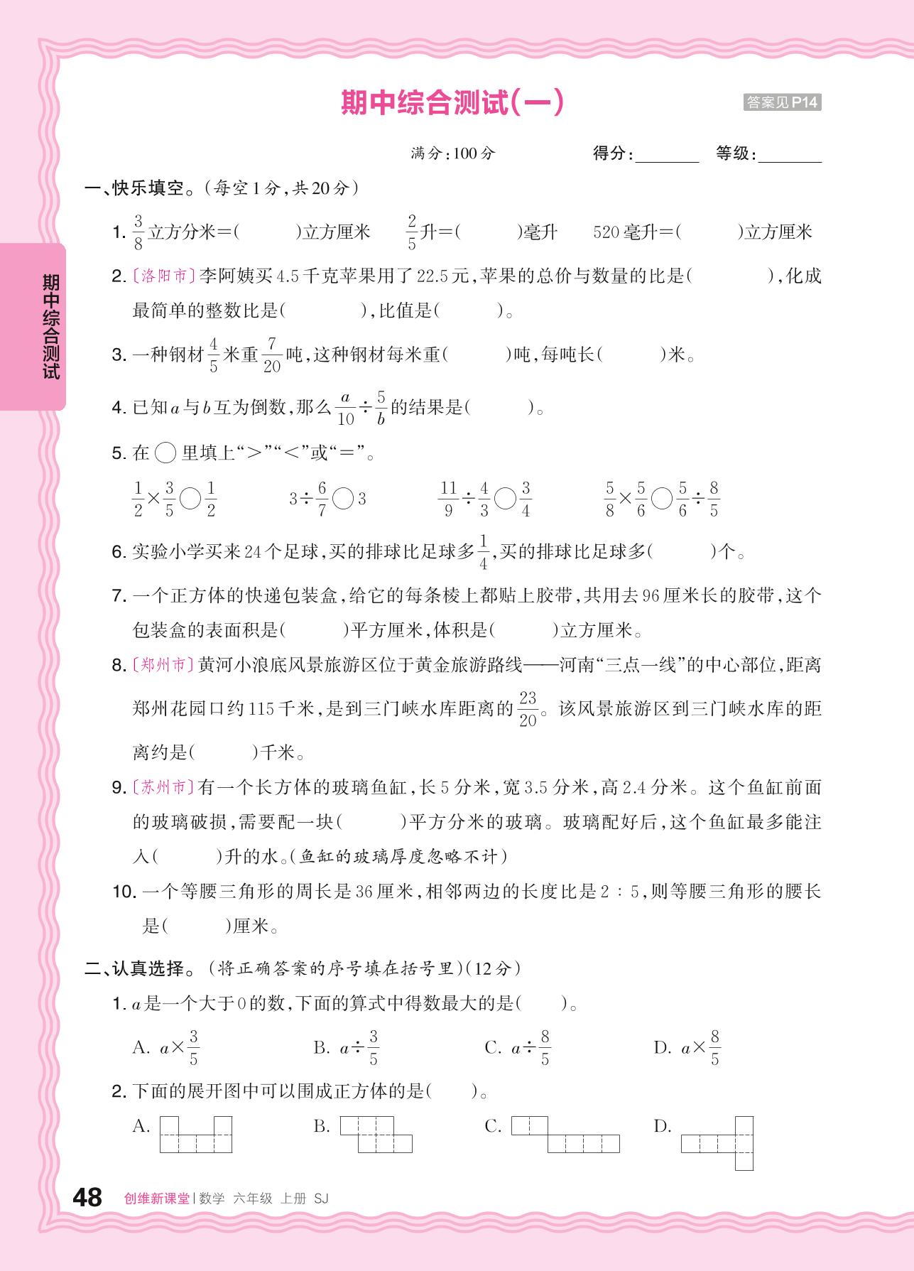 2024秋上册六年级数学苏教版 期中综合测试(一)