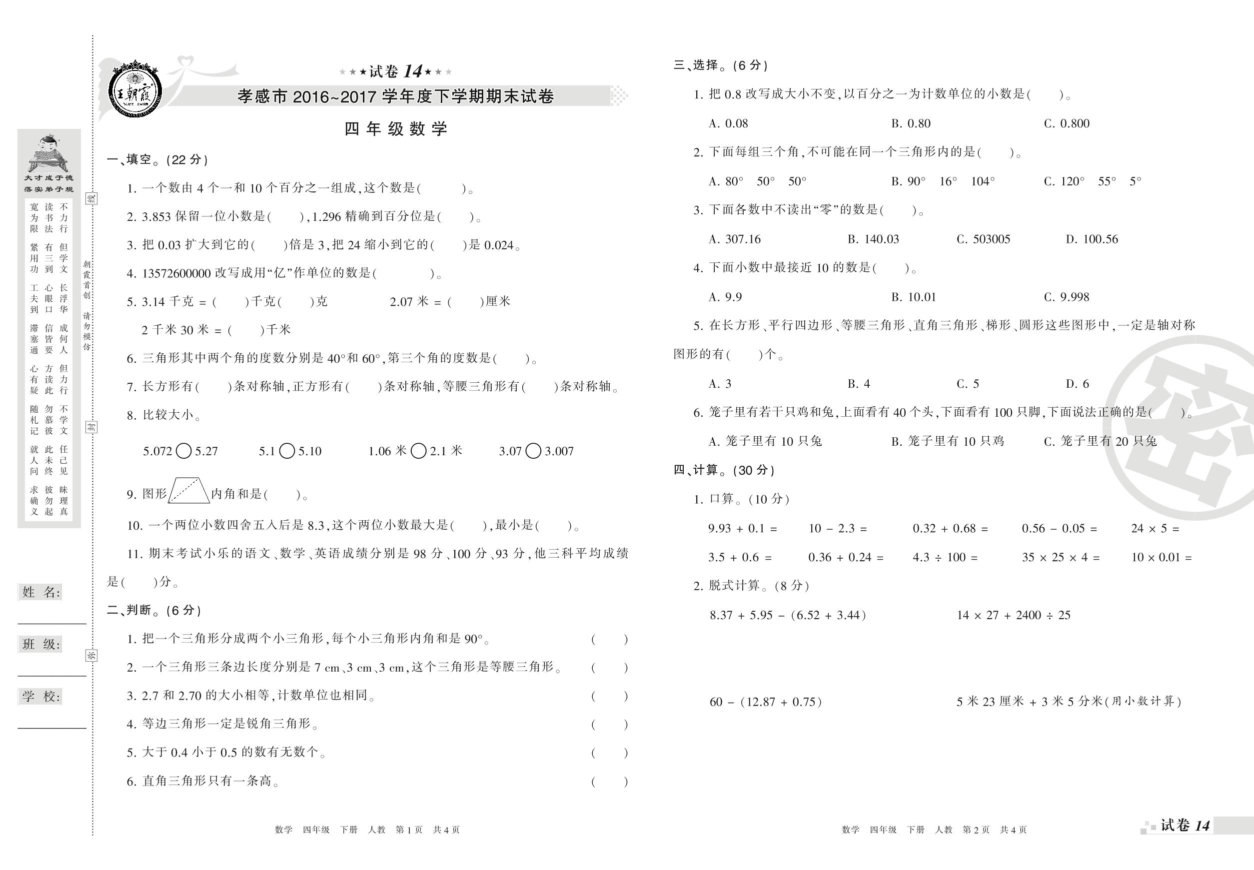 2016-2017学年第二学期孝感市四年级数学试卷(人教版)【14】