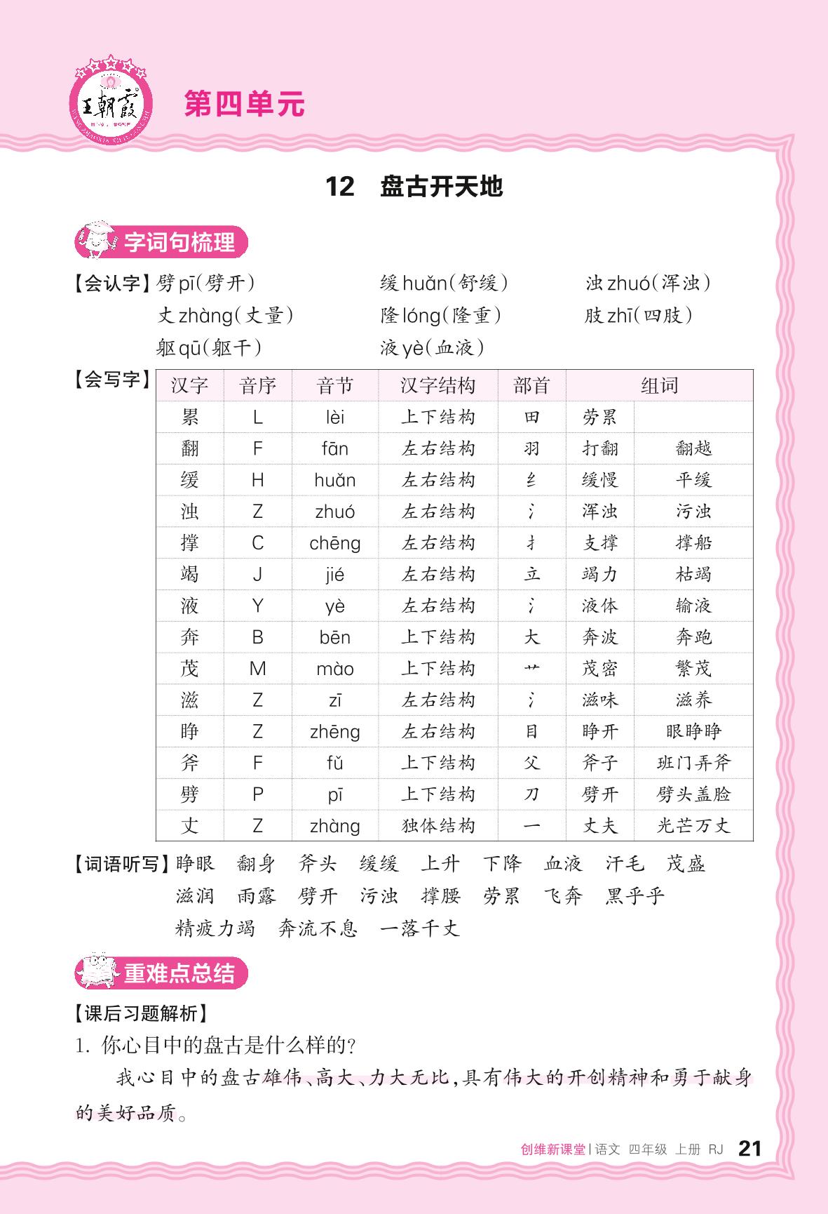 2024秋上册四年级语文人教版 助学手册 第四单元——12. 盘古开天地