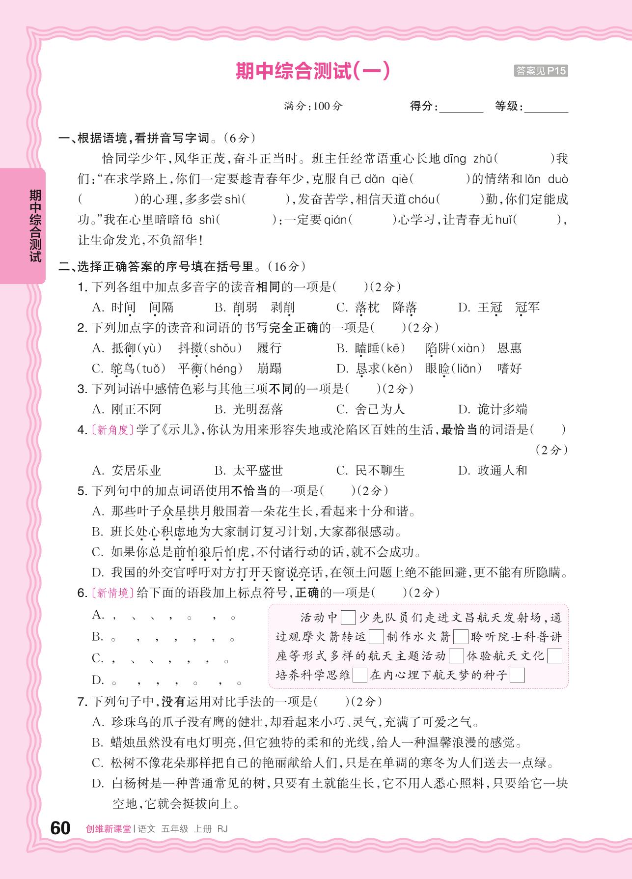 2024秋上册五年级语文人教版 期中综合测试(一)
