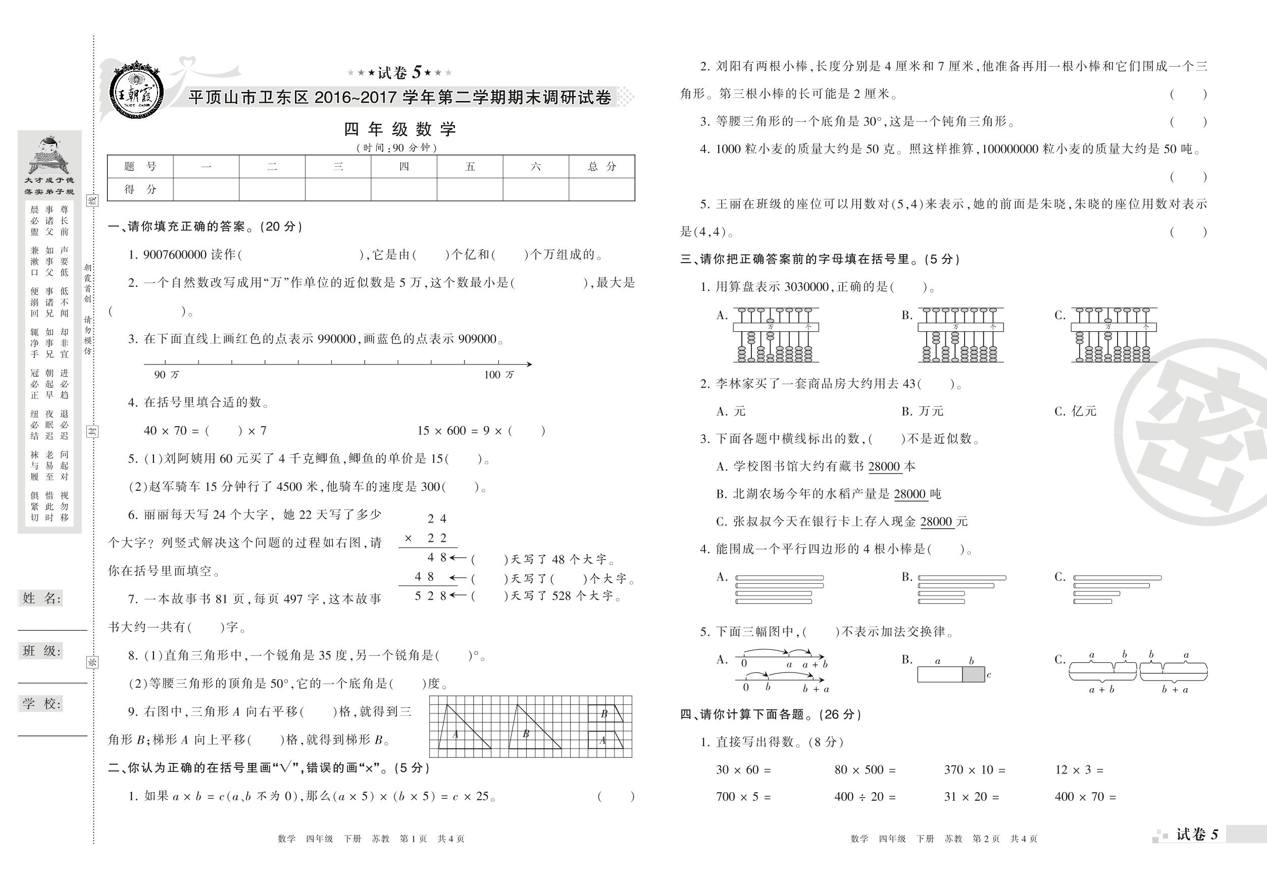 2016-2017学年第二学期平顶山市卫东区四年级数学试卷(苏教版)【5】