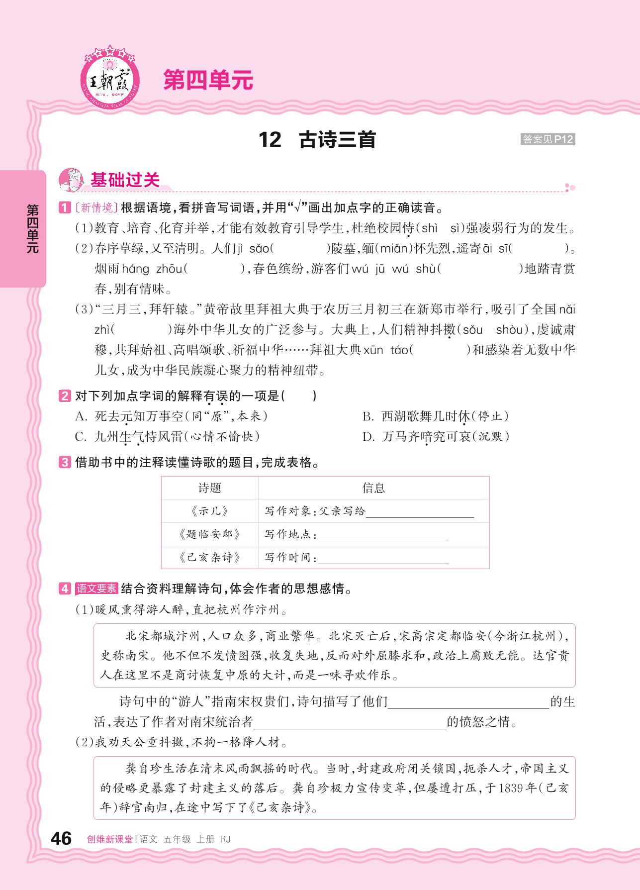 2024秋上册五年级语文人教版 第四单元 爱国情怀——12. 古诗三首