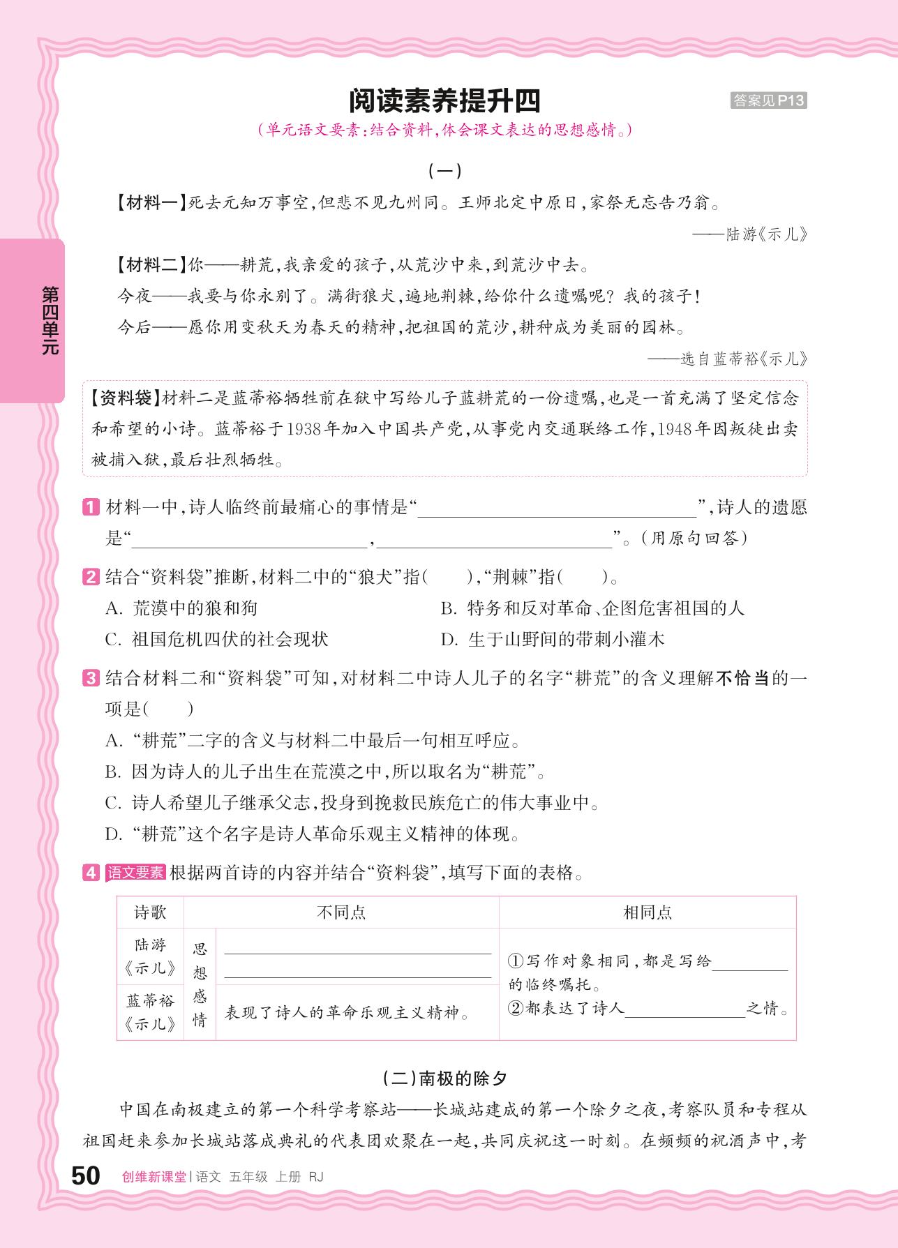 2024秋上册五年级语文人教版 第四单元 爱国情怀——阅读素养提升四
