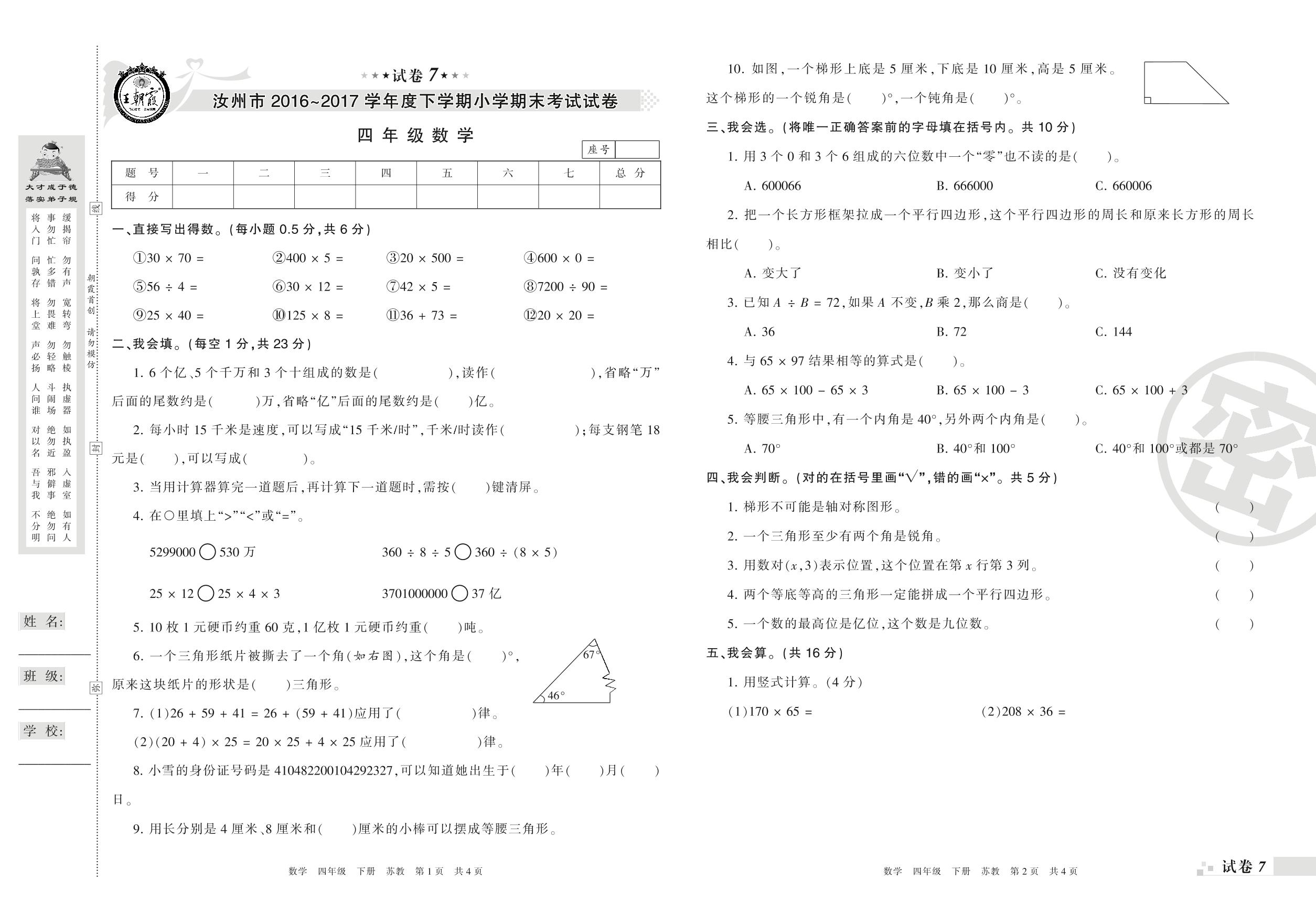 2016-2017学年第二学期汝州市四年级数学试卷(苏教版)【7】