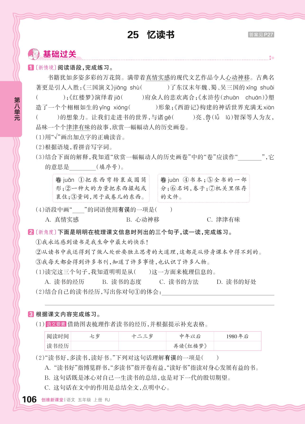 2024秋上册五年级语文人教版 第八单元 读书明智——25. 忆读书