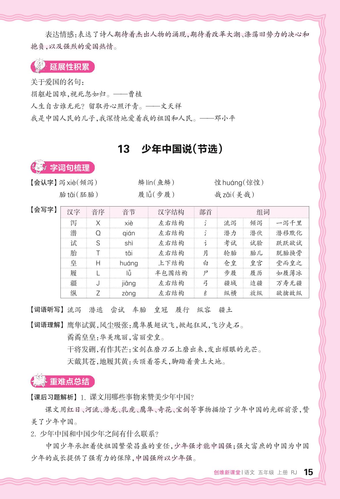 2024秋上册五年级语文人教版 助学手册 第四单元——13. 少年中国说(节选)