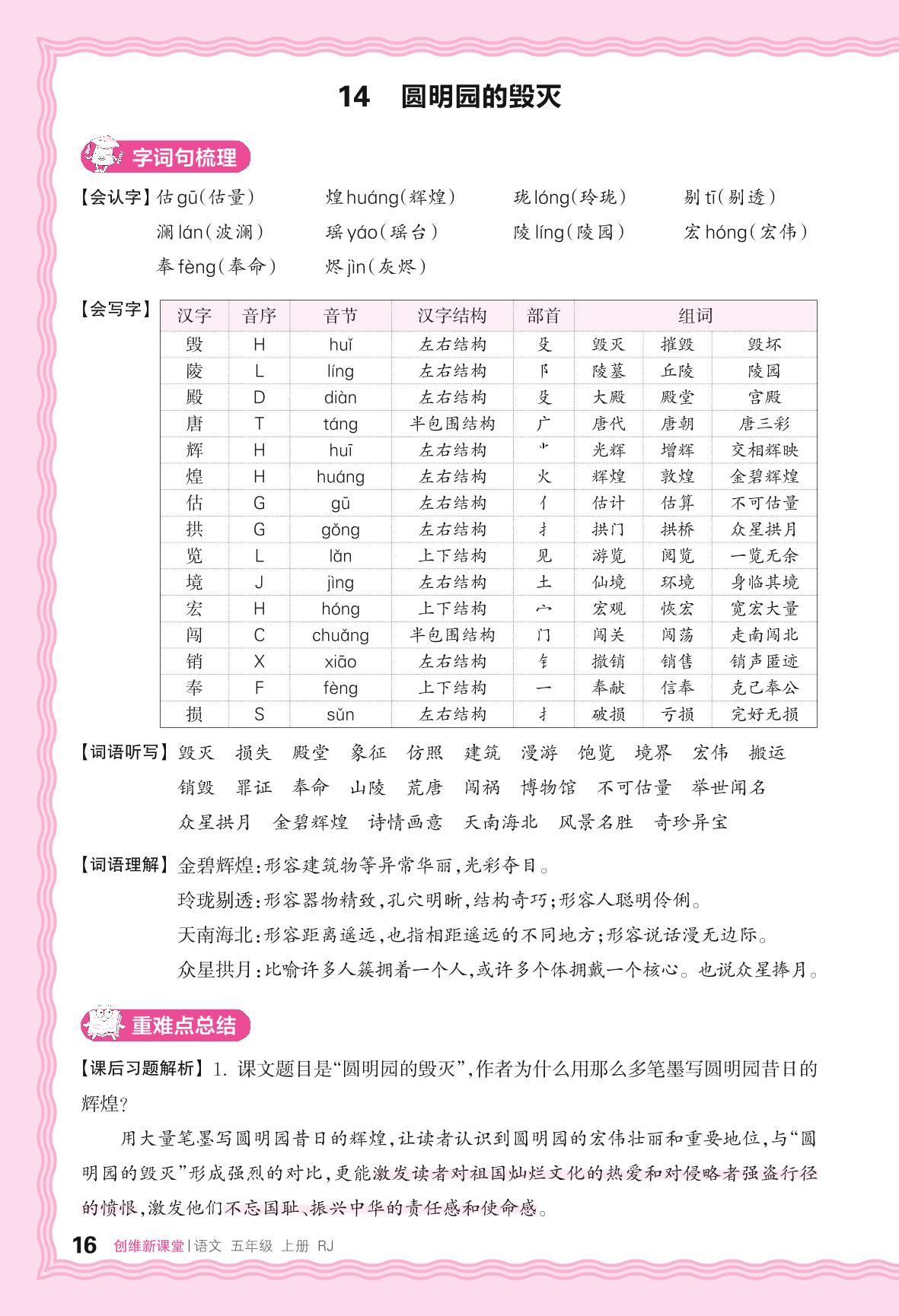 2024秋上册五年级语文人教版 助学手册 第四单元——14. 圆明园的毁灭