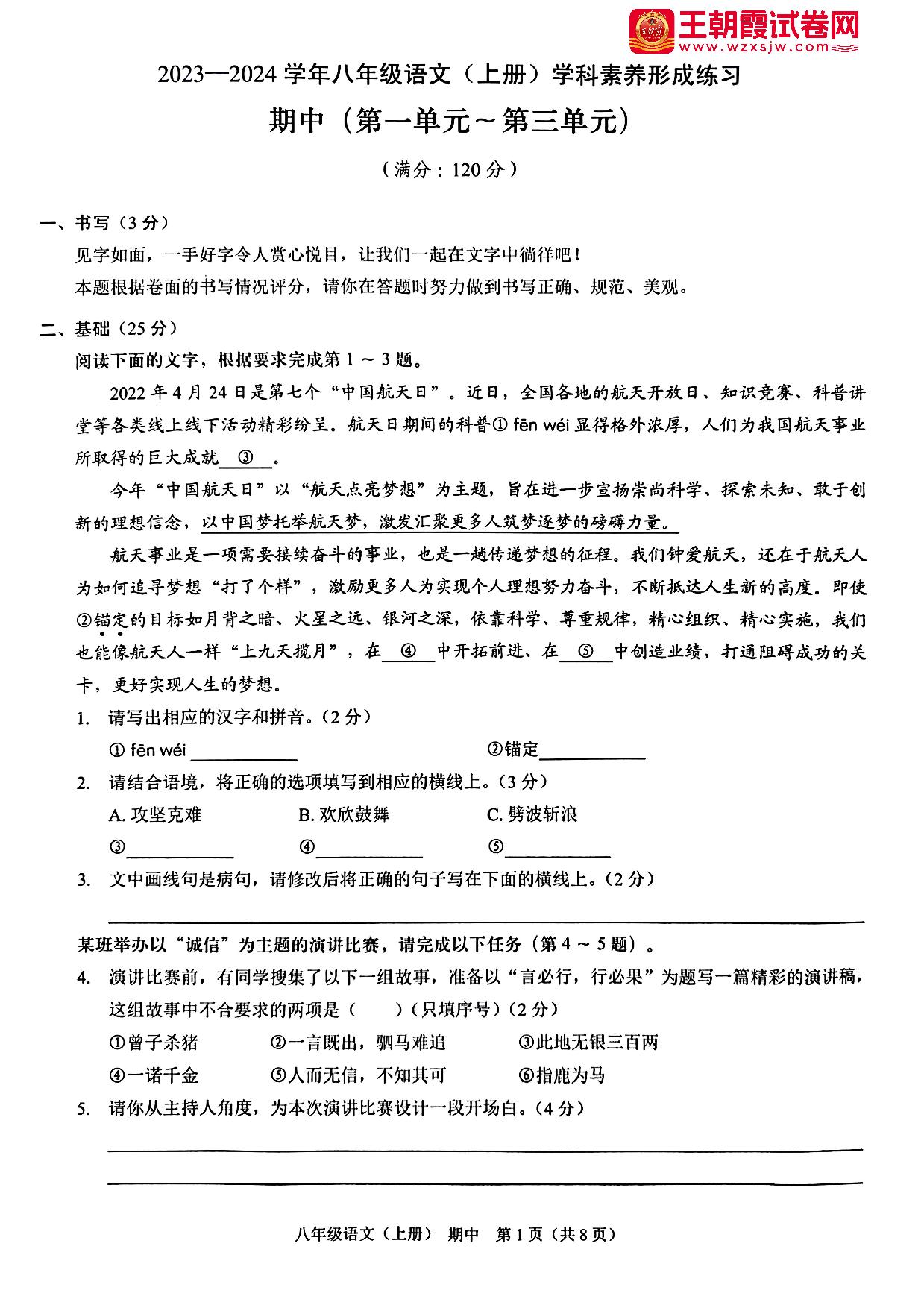 广东省深圳市龙岗区宏扬学校2023-2024学年上学期期中学科素养试题八年级语文(人教版)