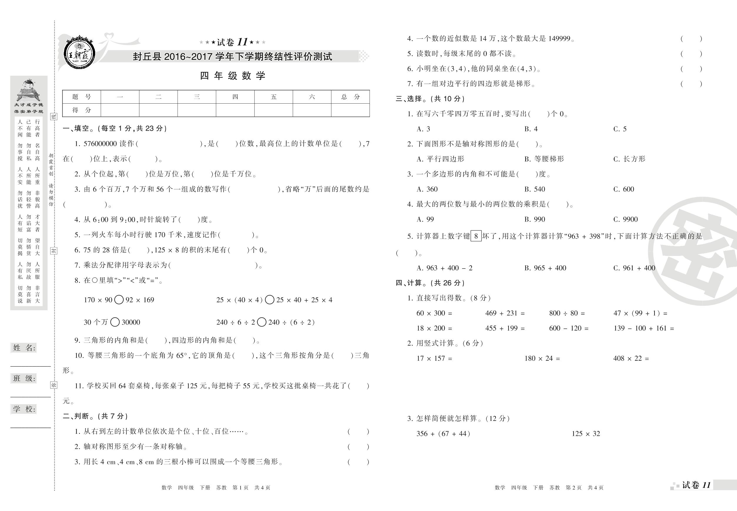 2016-2017学年第二学期新乡市封丘县四年级数学试卷(苏教版)【11】