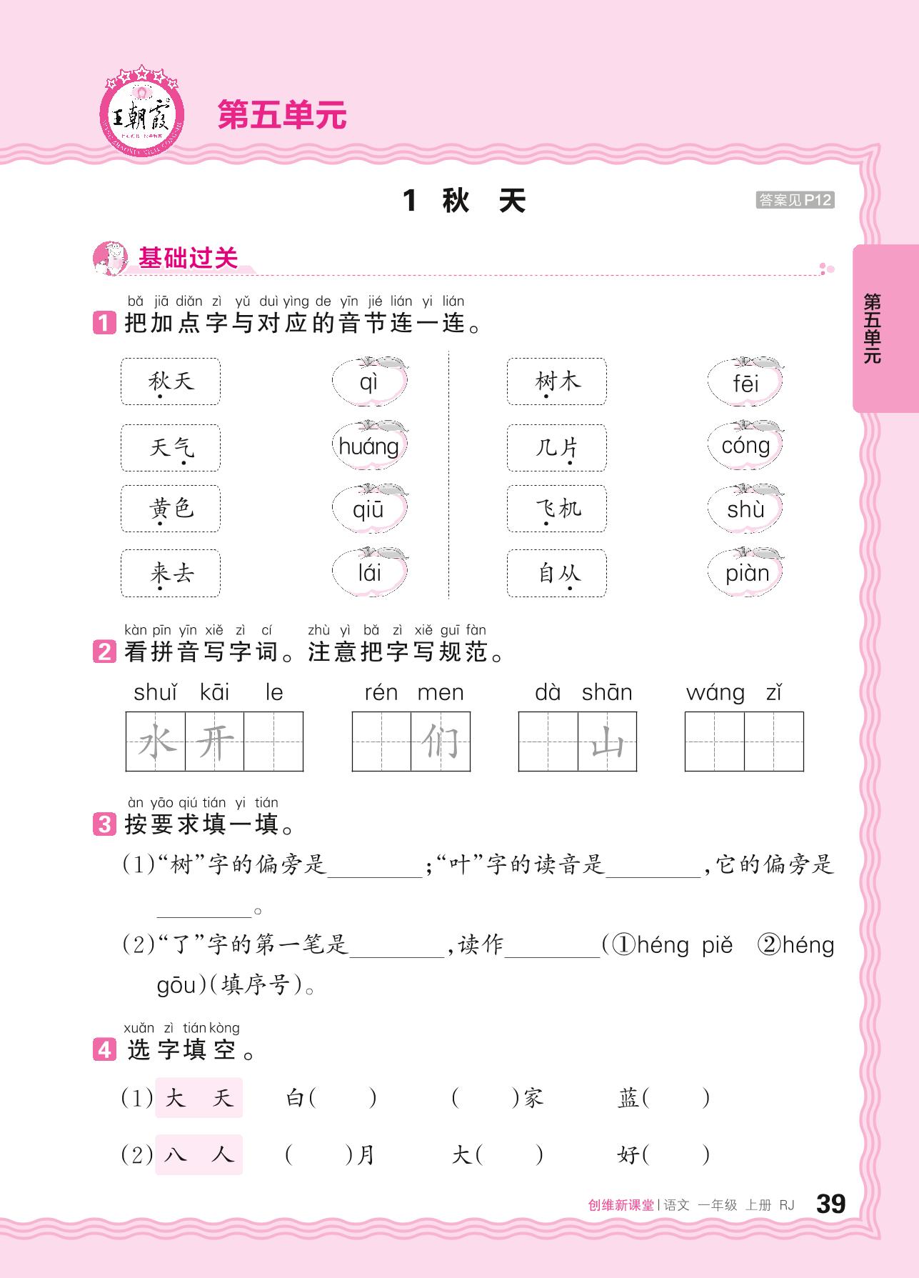 2024秋上册一年级语文人教版 第五单元 阅读——1. 秋天_R240820104350682