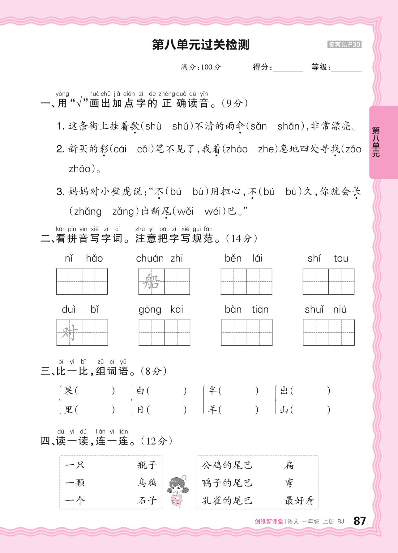 2024秋上册一年级语文人教版 第八单元过关检测