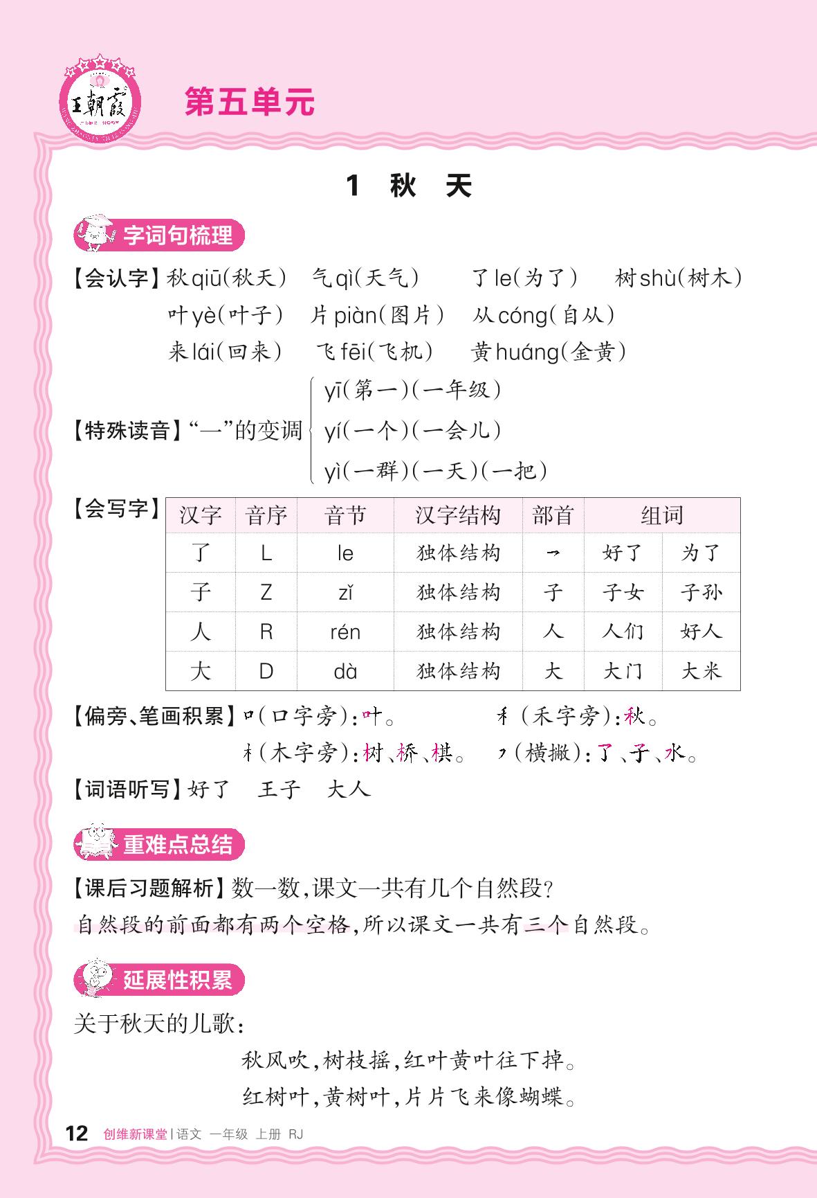 2024秋上册一年级语文人教版 助学手册 第五单元——1. 秋天