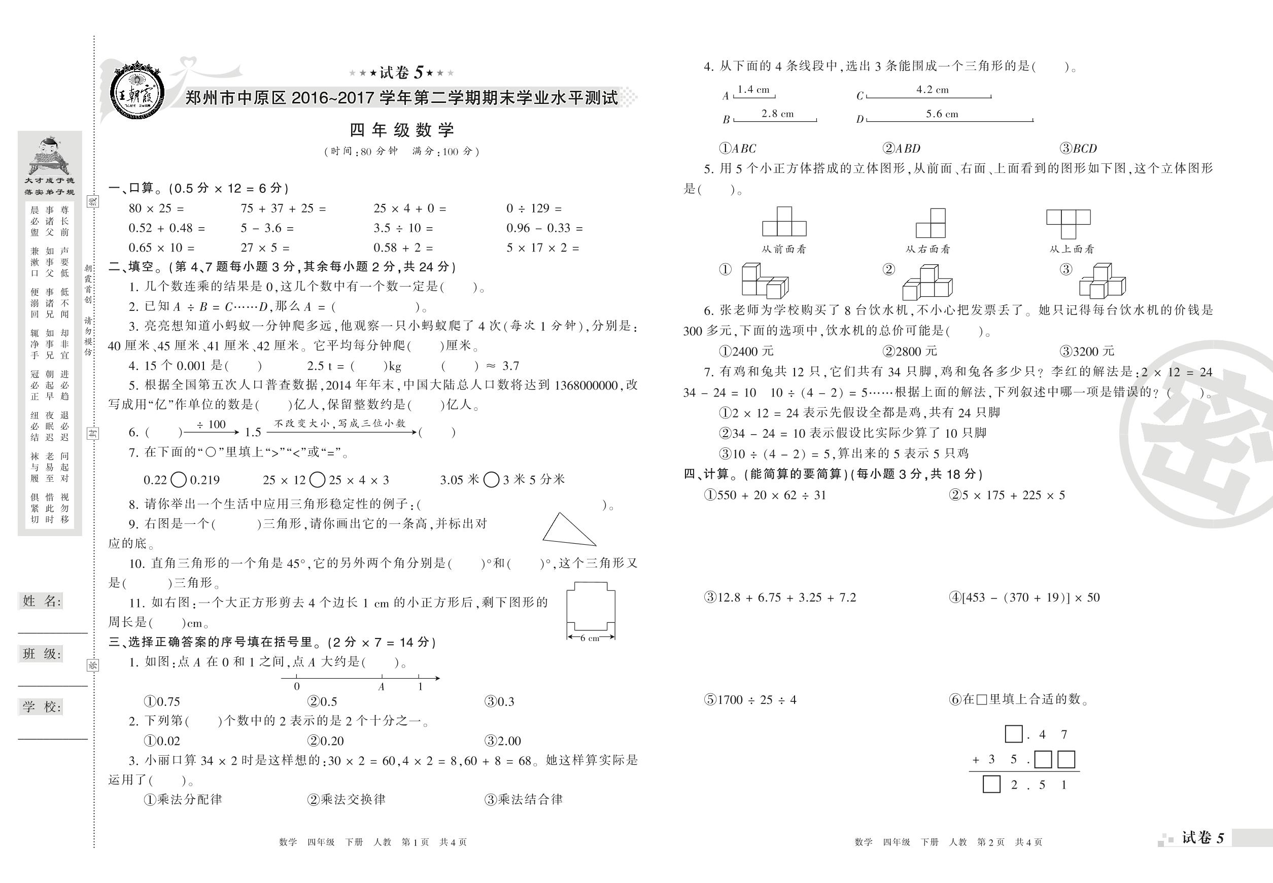 2016-2017学年第二学期郑州市中原区四年级数学试卷(人教版)【5】