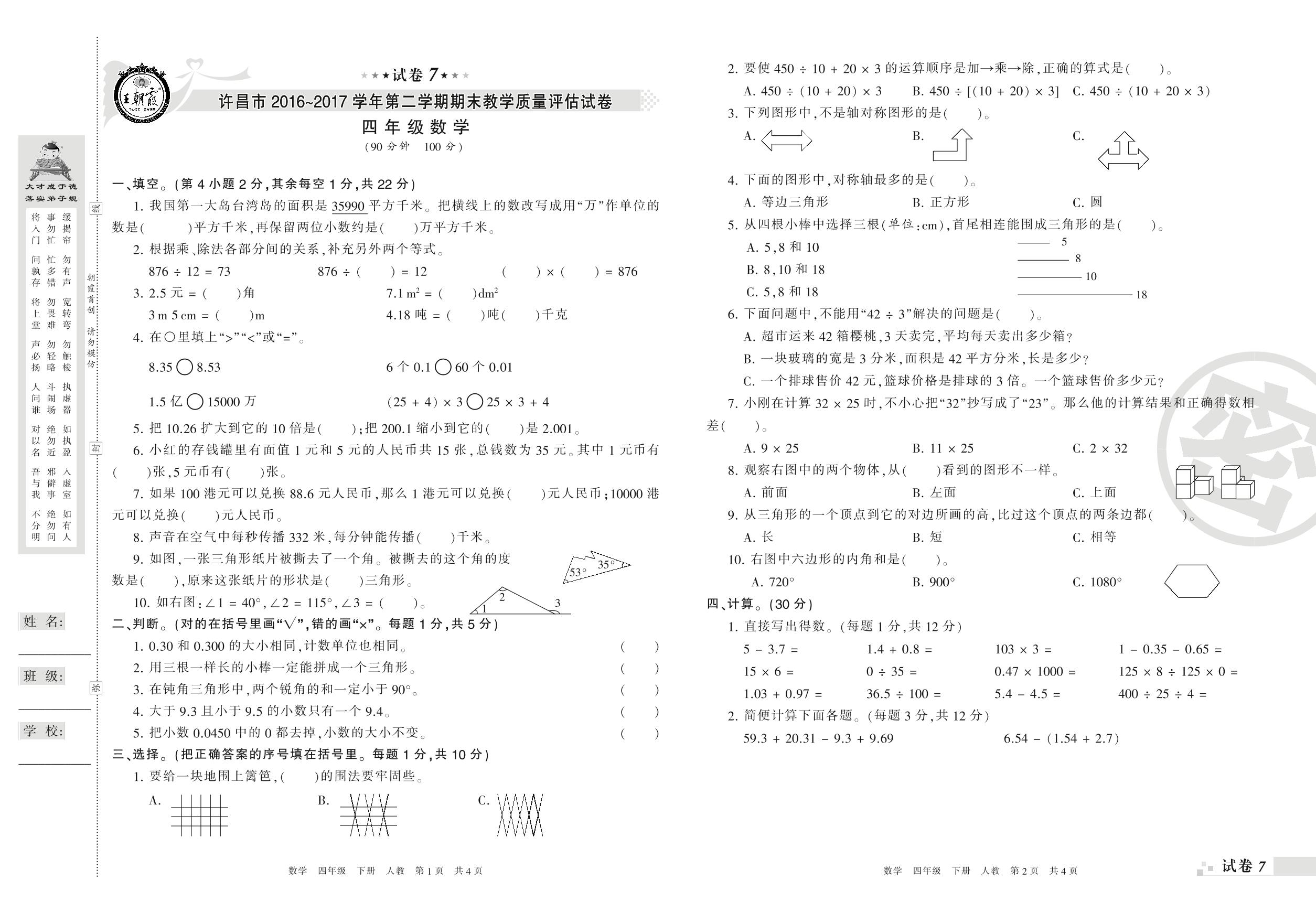 2016-2017学年第二学期许昌市四年级数学试卷(人教版)【7】