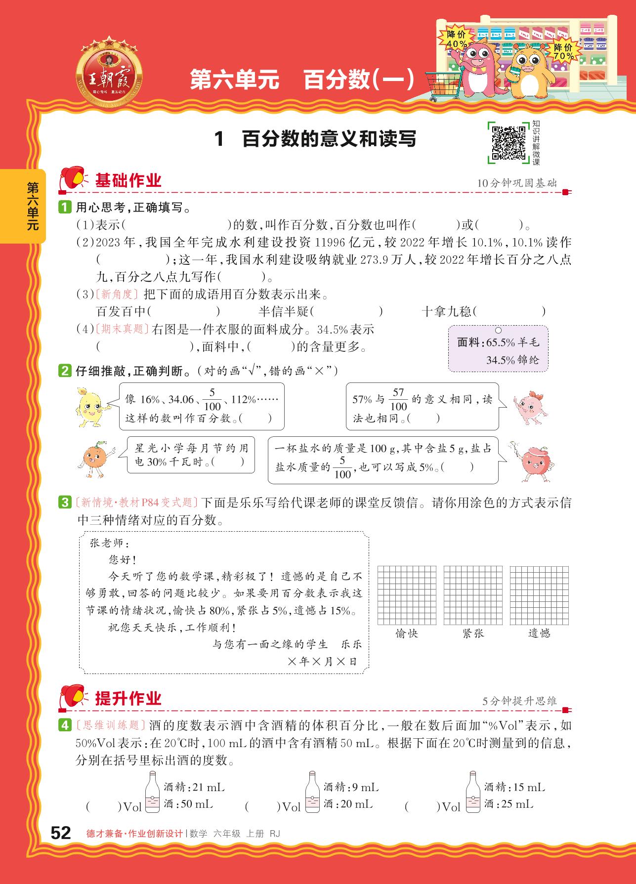 2024秋上册六年级数学人教版 第六单元 百分数(一)——1. 百分数的意义和读写