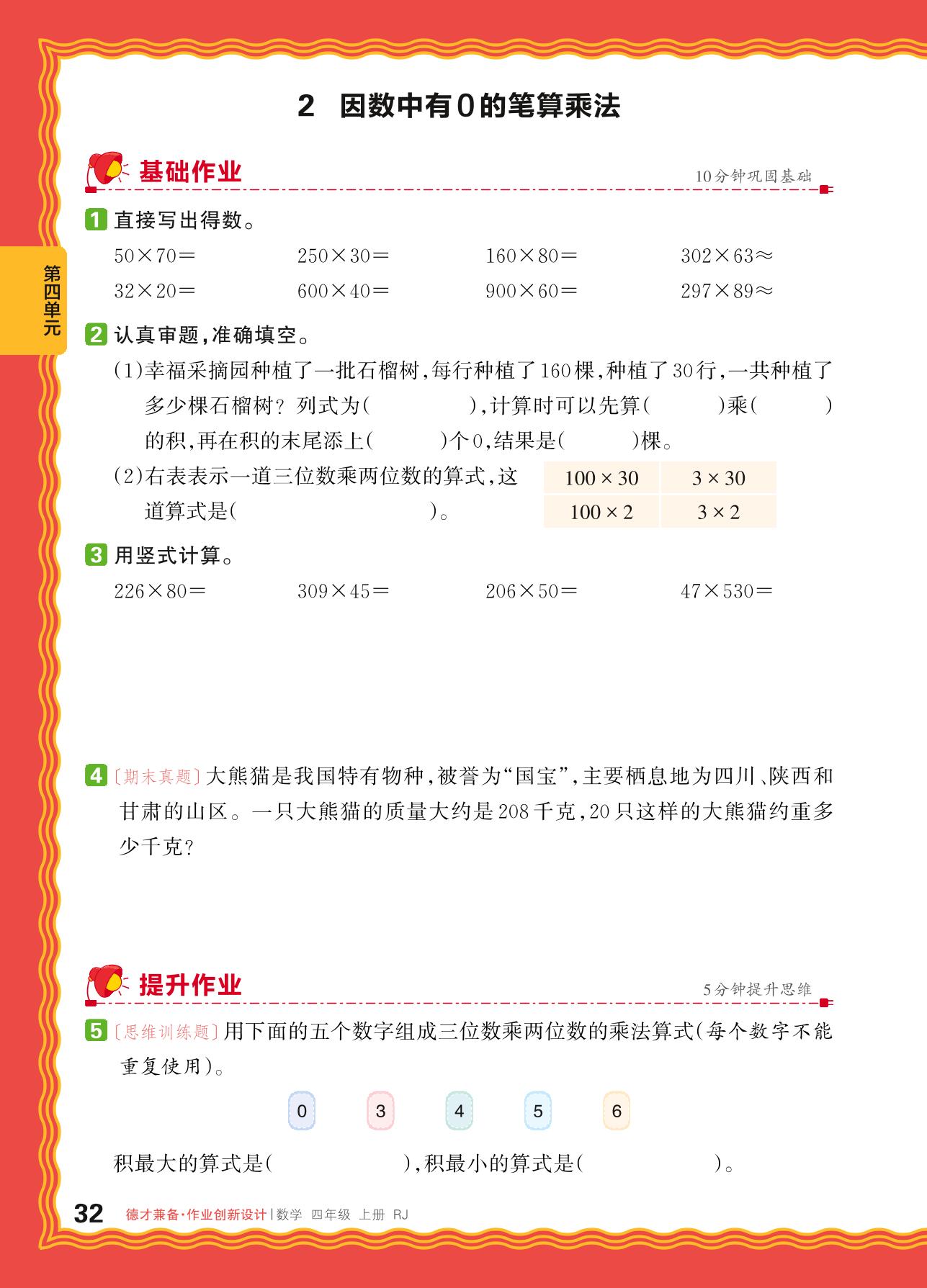 2024秋上册四年级数学人教版 第四单元 三位数乘两位数——2. 因数中有0的笔算乘法