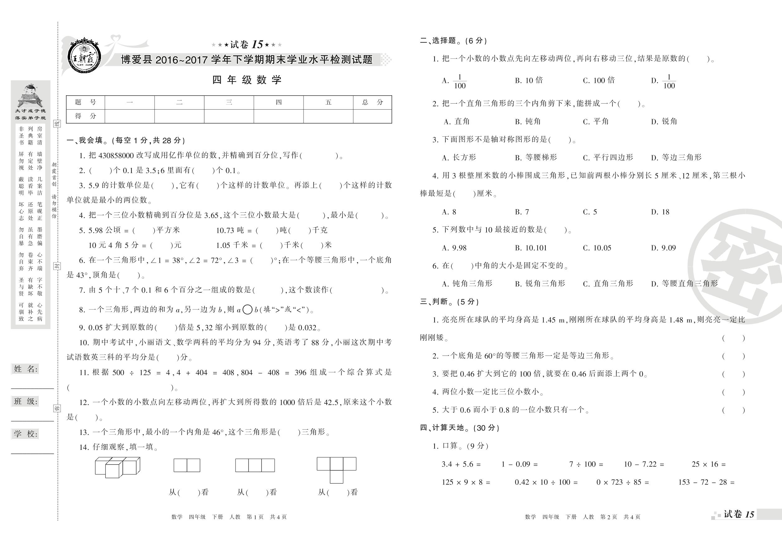 2016-2017学年第二学期焦作市博爱县四年级数学试卷(人教版)【15】