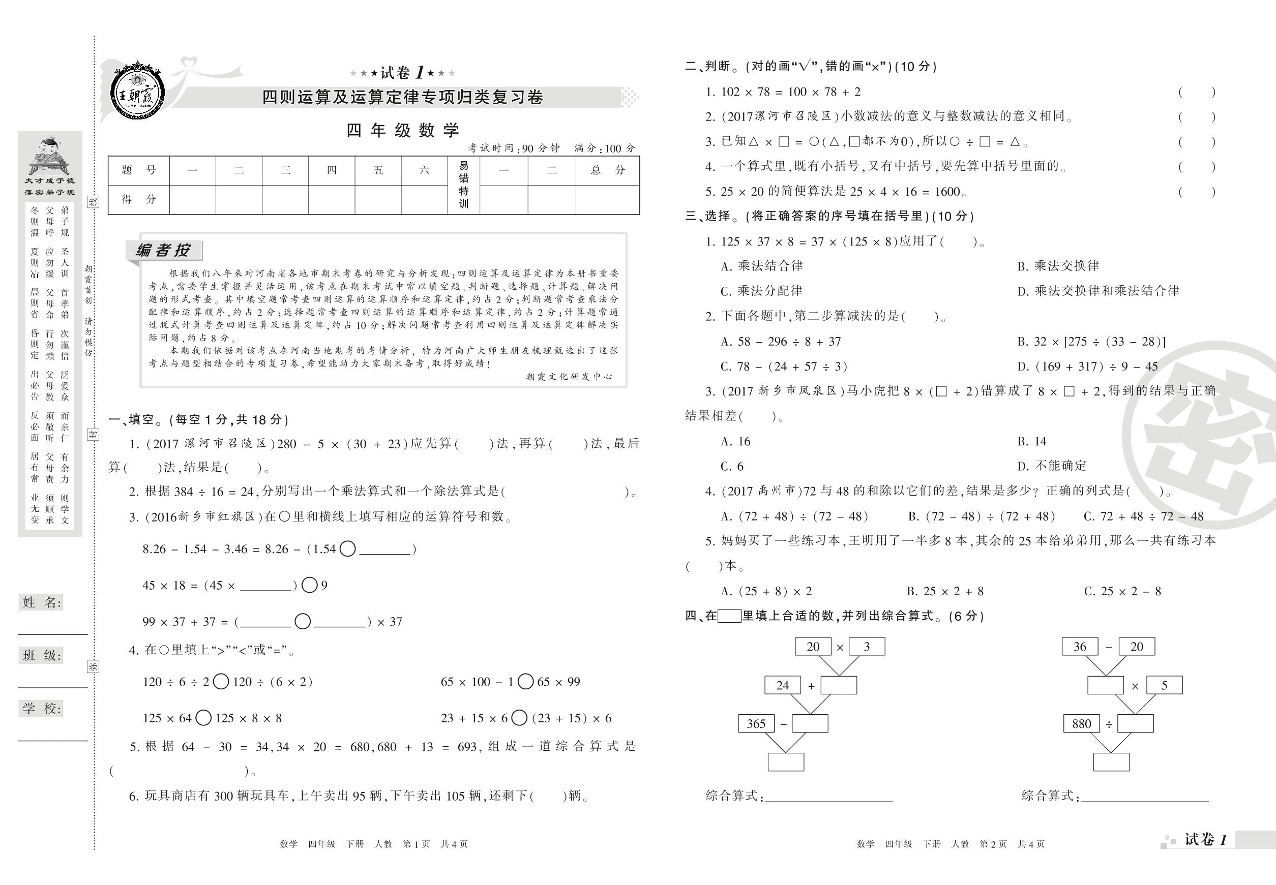 王朝霞期末专项卷——四则运算及运算定律专项归类复习卷四年级下册数学(人教版)_R210804160627【1】