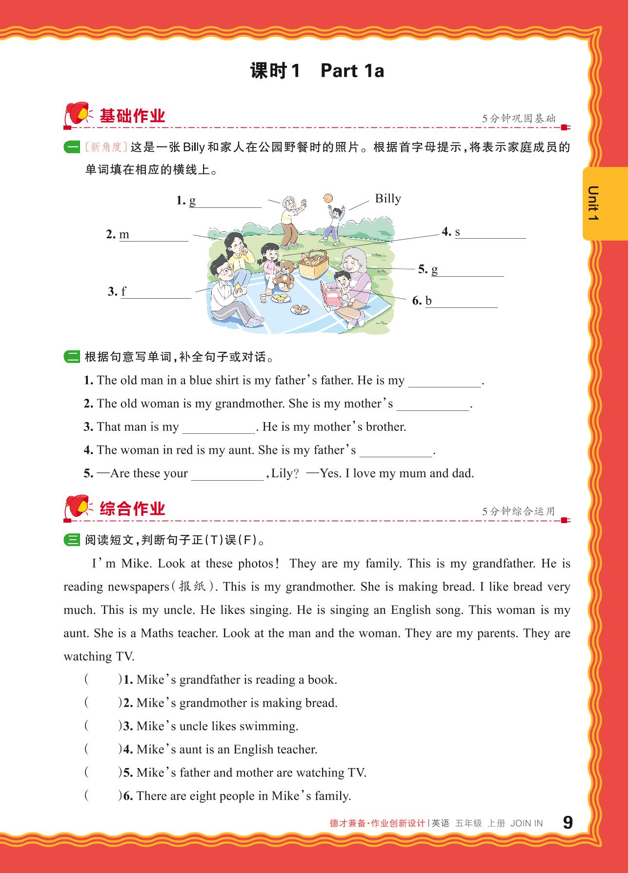 2024秋上册五年级英语剑桥版 Unit 1—课时 1 Part 1a