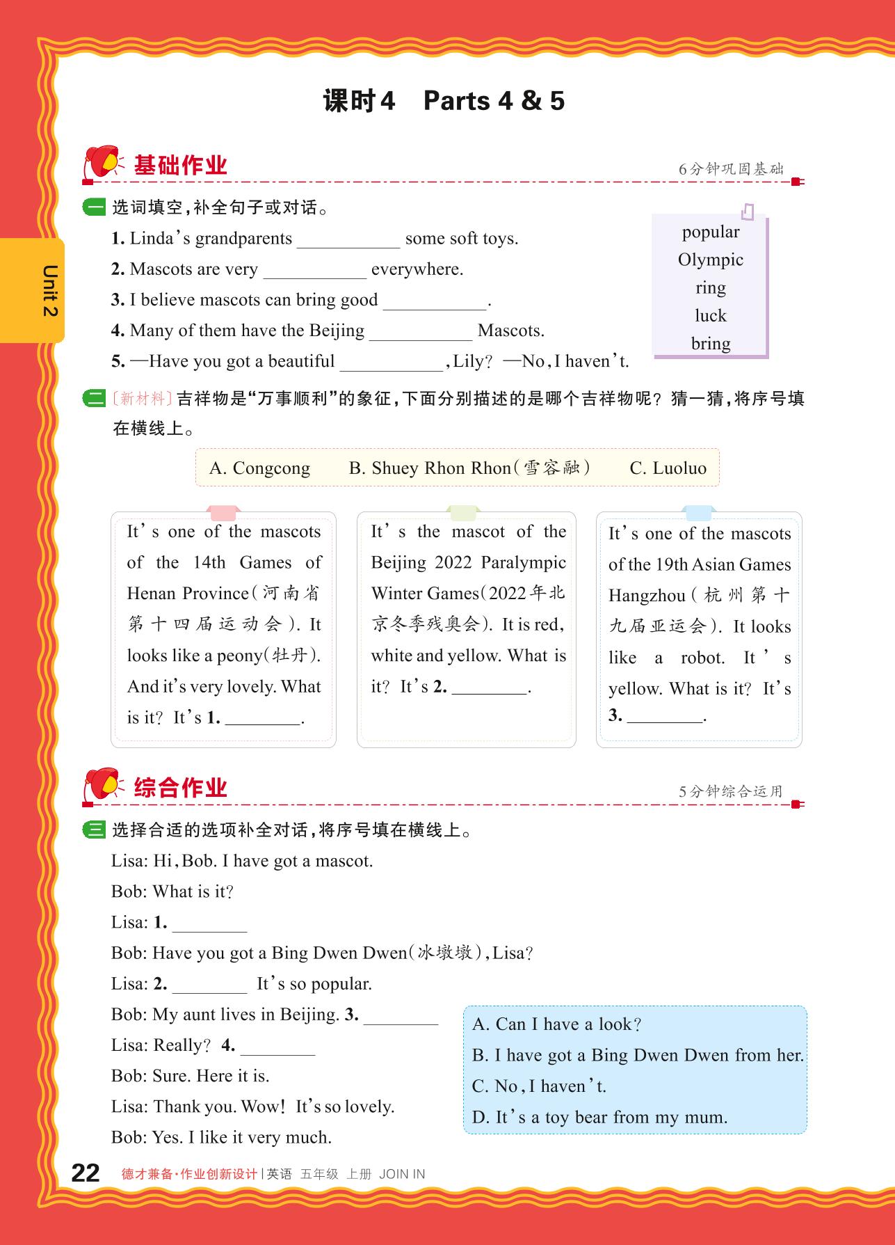 2024秋上册五年级英语剑桥版 Unit 2—课时 4 Parts 4 & 5