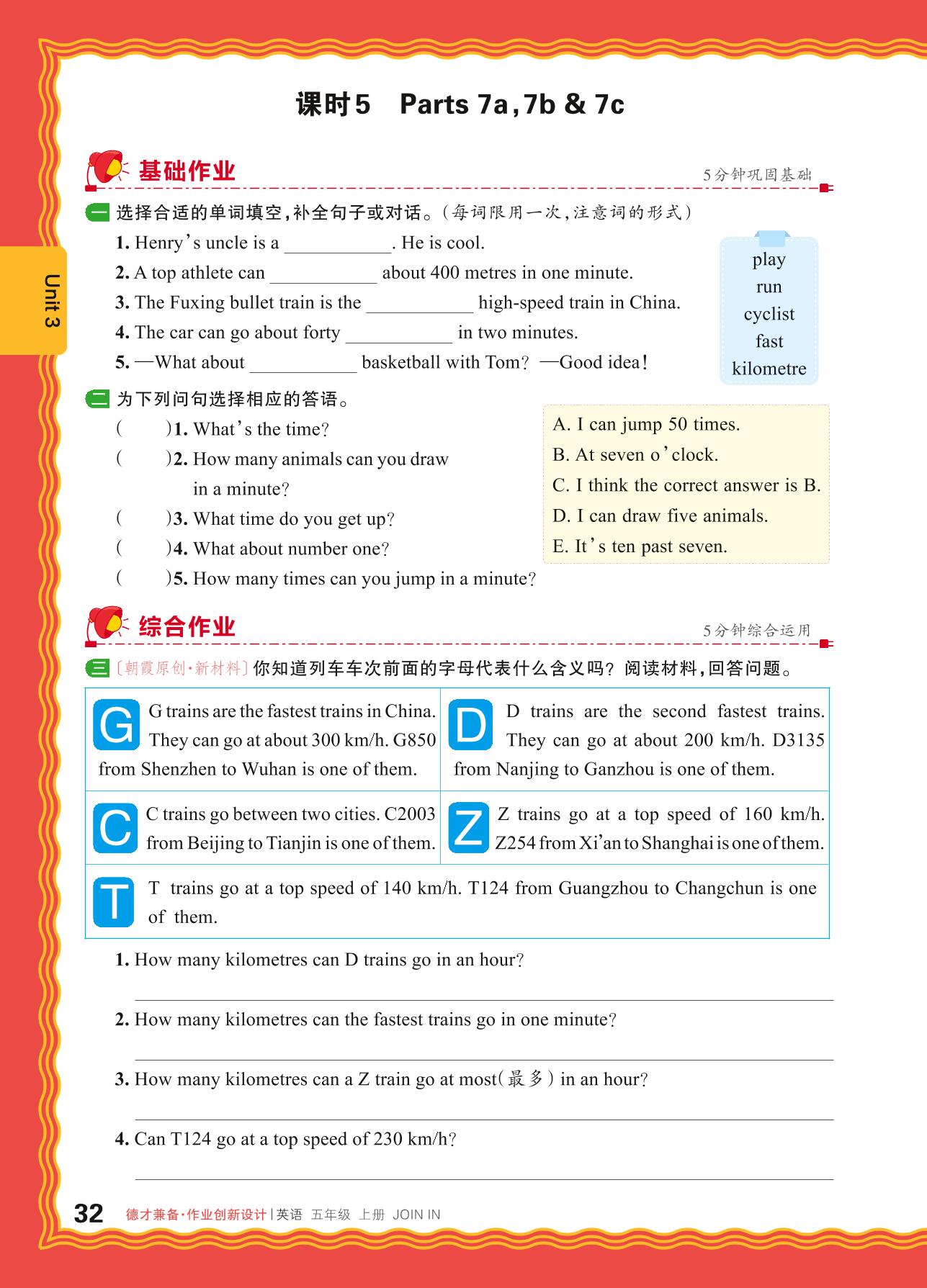2024秋上册五年级英语剑桥版 Unit 3—课时 5 Parts 7a,7b & 7c
