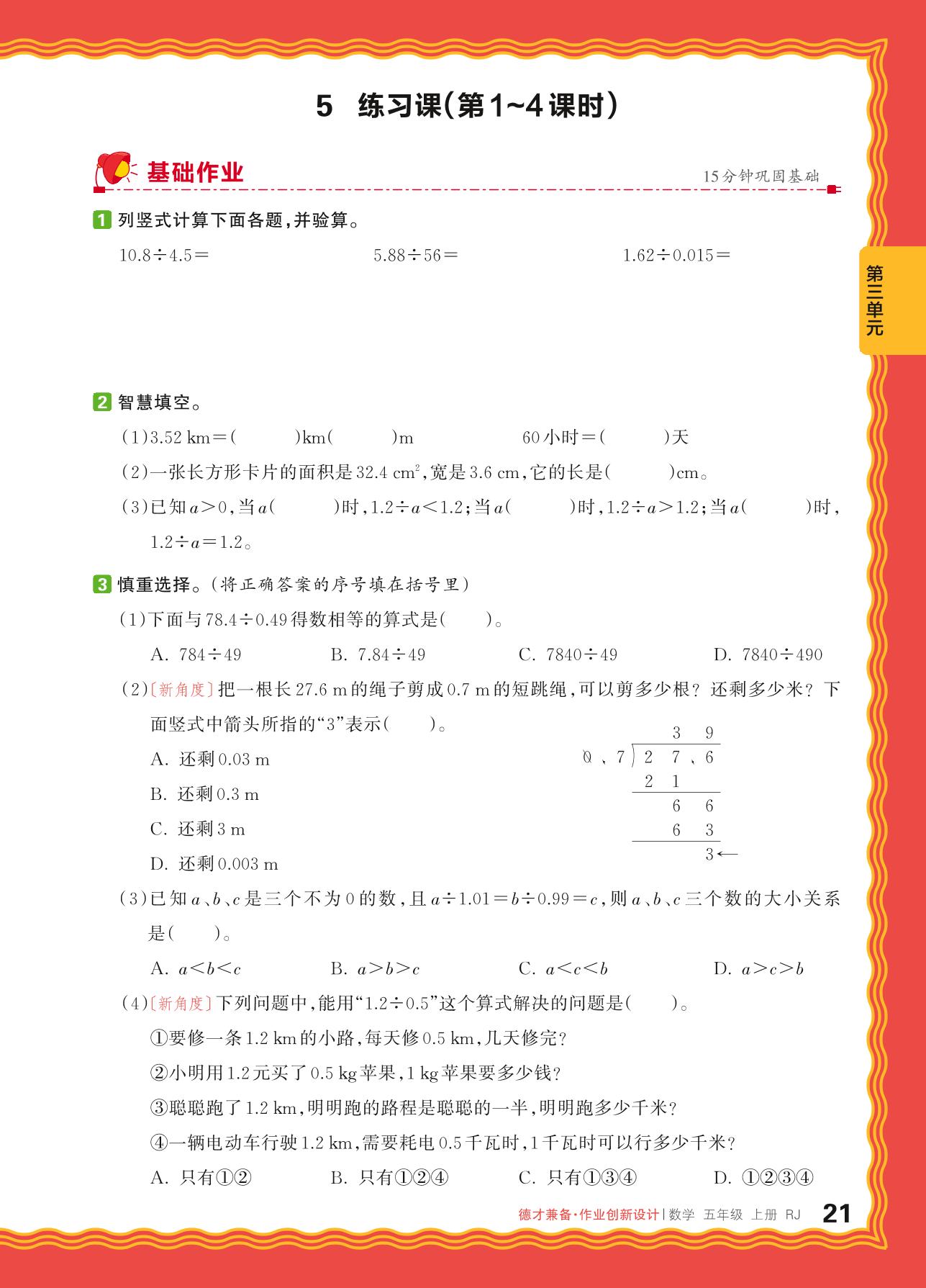 2024秋上册五年级数学人教版 第三单元 小数除法——5. 除数是整数的小数除法、一个数除以小数练习课