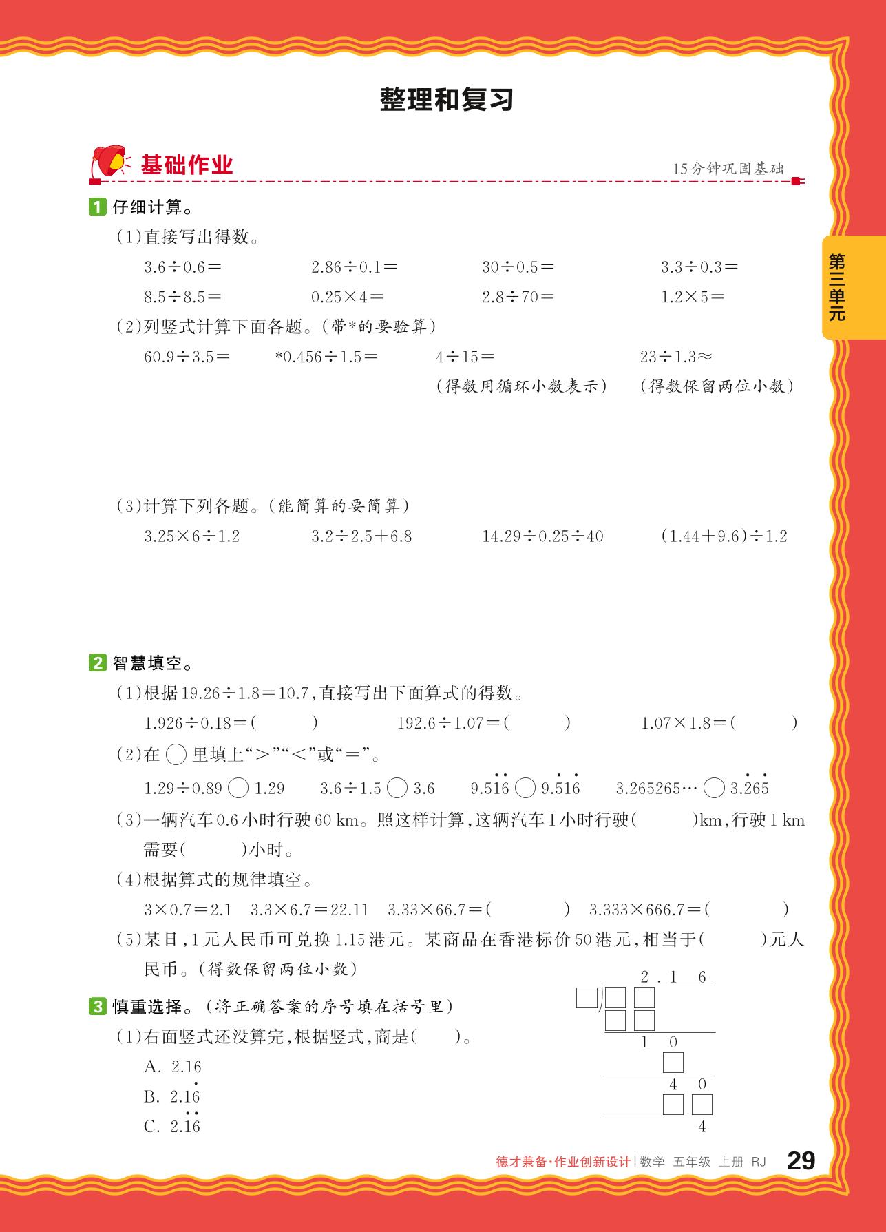 2024秋上册五年级数学人教版 第三单元 小数除法——整理和复习