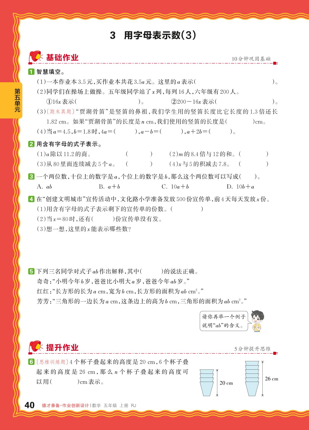 2024秋上册五年级数学人教版 第五单元 简易方程——3. 用字母表示数(3)