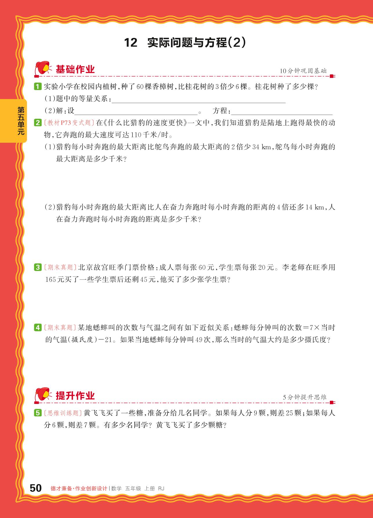 2024秋上册五年级数学人教版 第五单元 简易方程——12. 实际问题与方程(2)