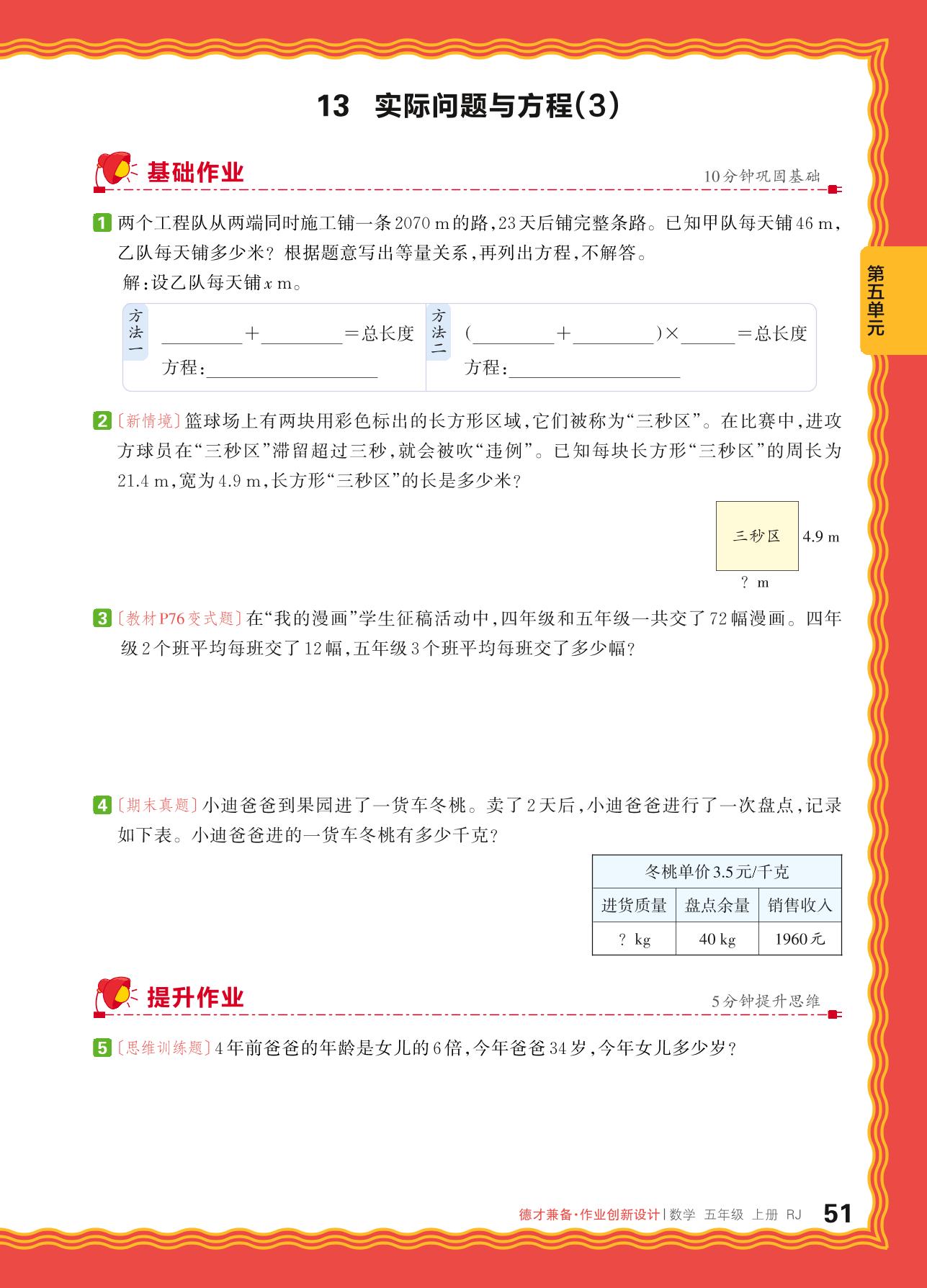 2024秋上册五年级数学人教版 第五单元 简易方程——13. 实际问题与方程(3)
