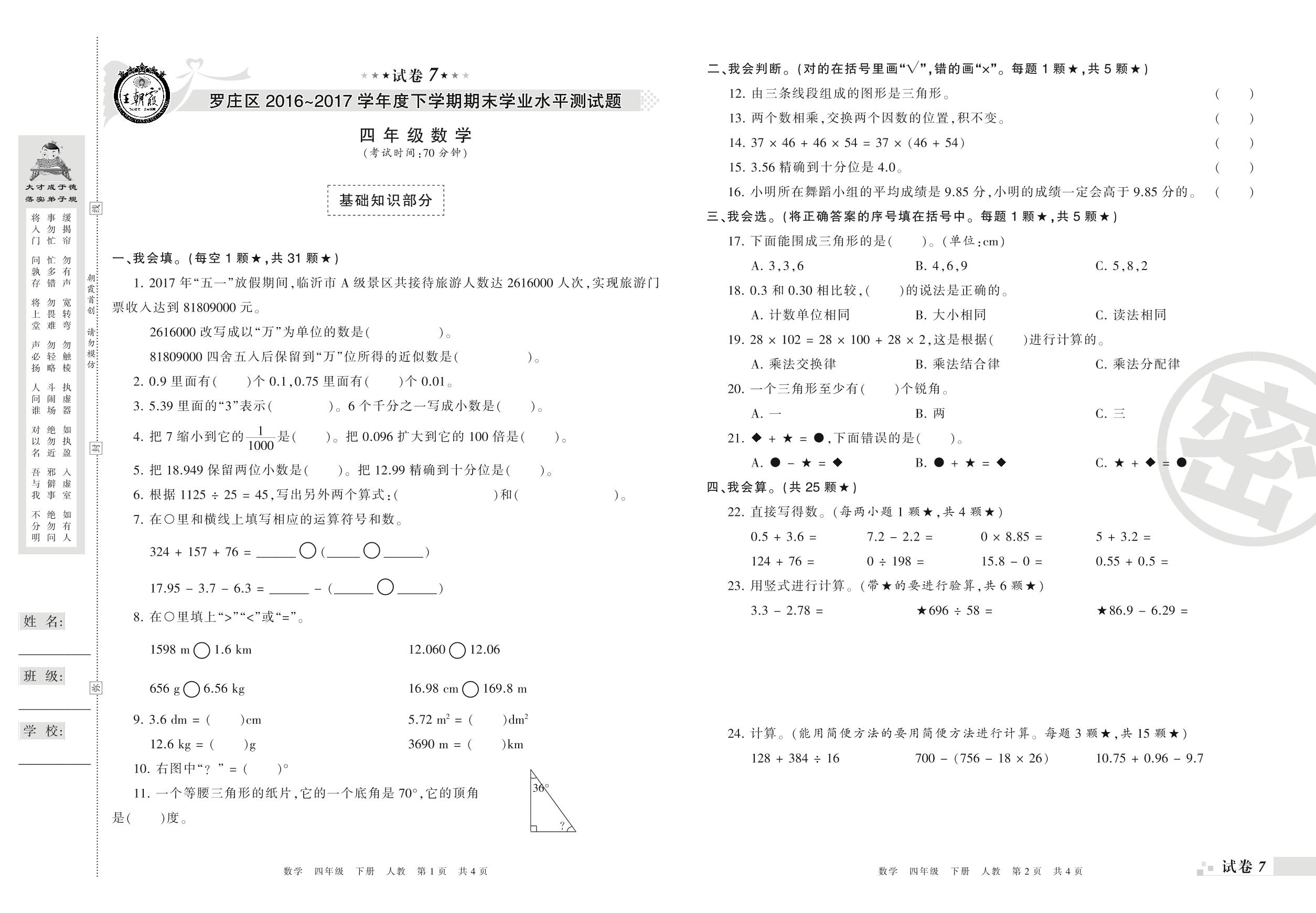 2016-2017学年第二学期临沂市罗庄区四年级数学试卷(人教版)【7】