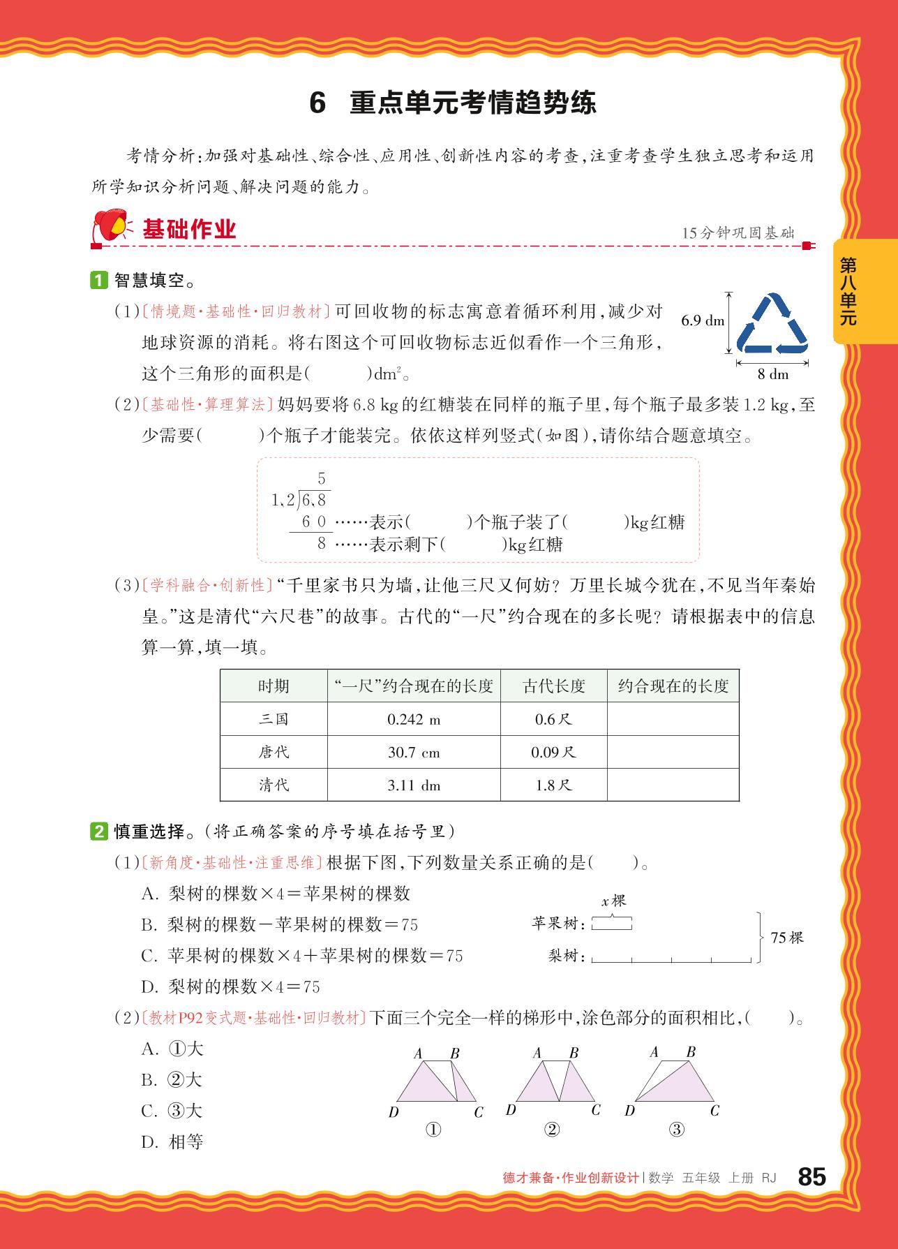 2024秋上册五年级数学人教版 第八单元 总复习——6. 重点单元考情趋势练