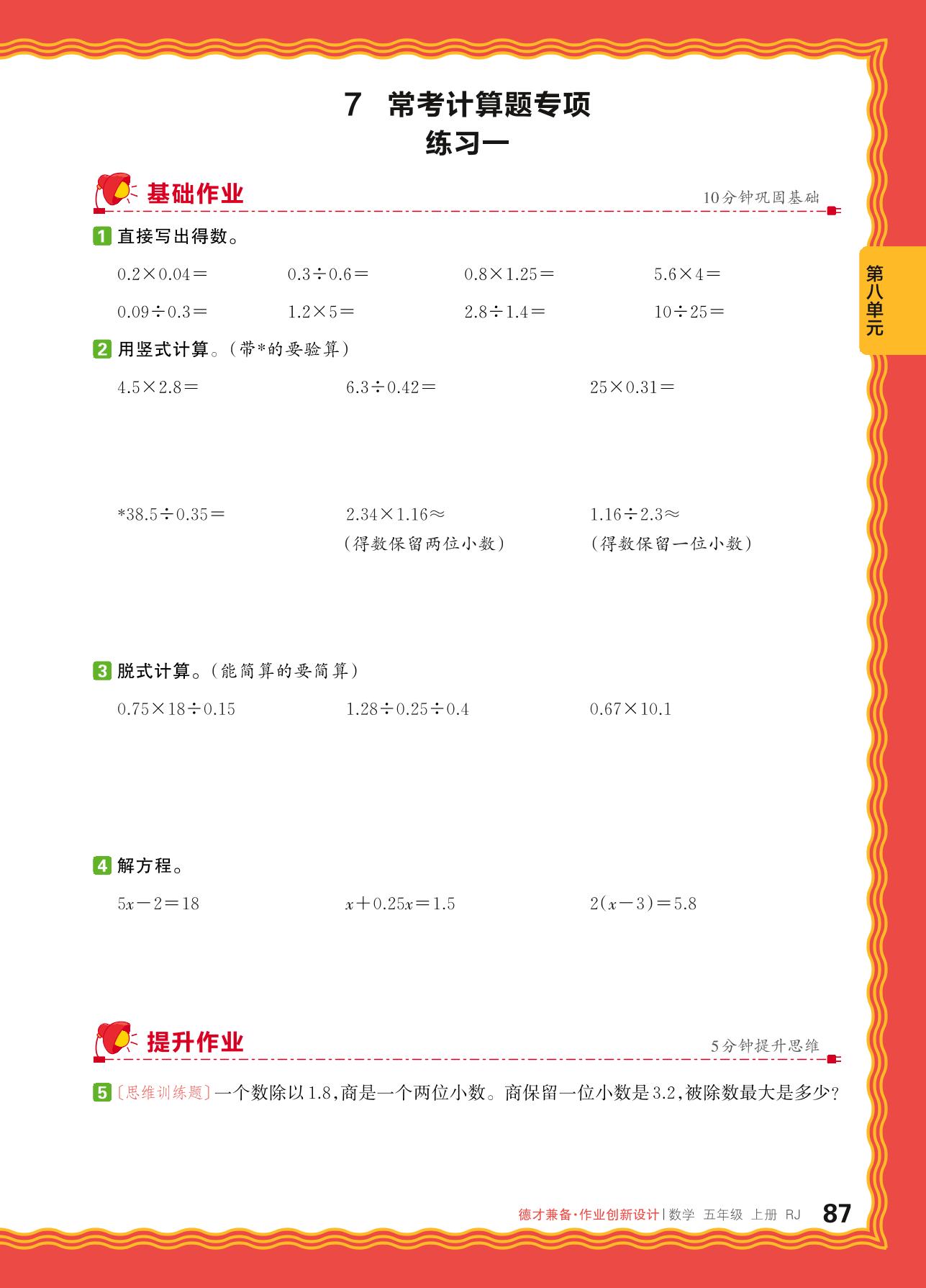 2024秋上册五年级数学人教版 第八单元 总复习——7. 常考计算题专项