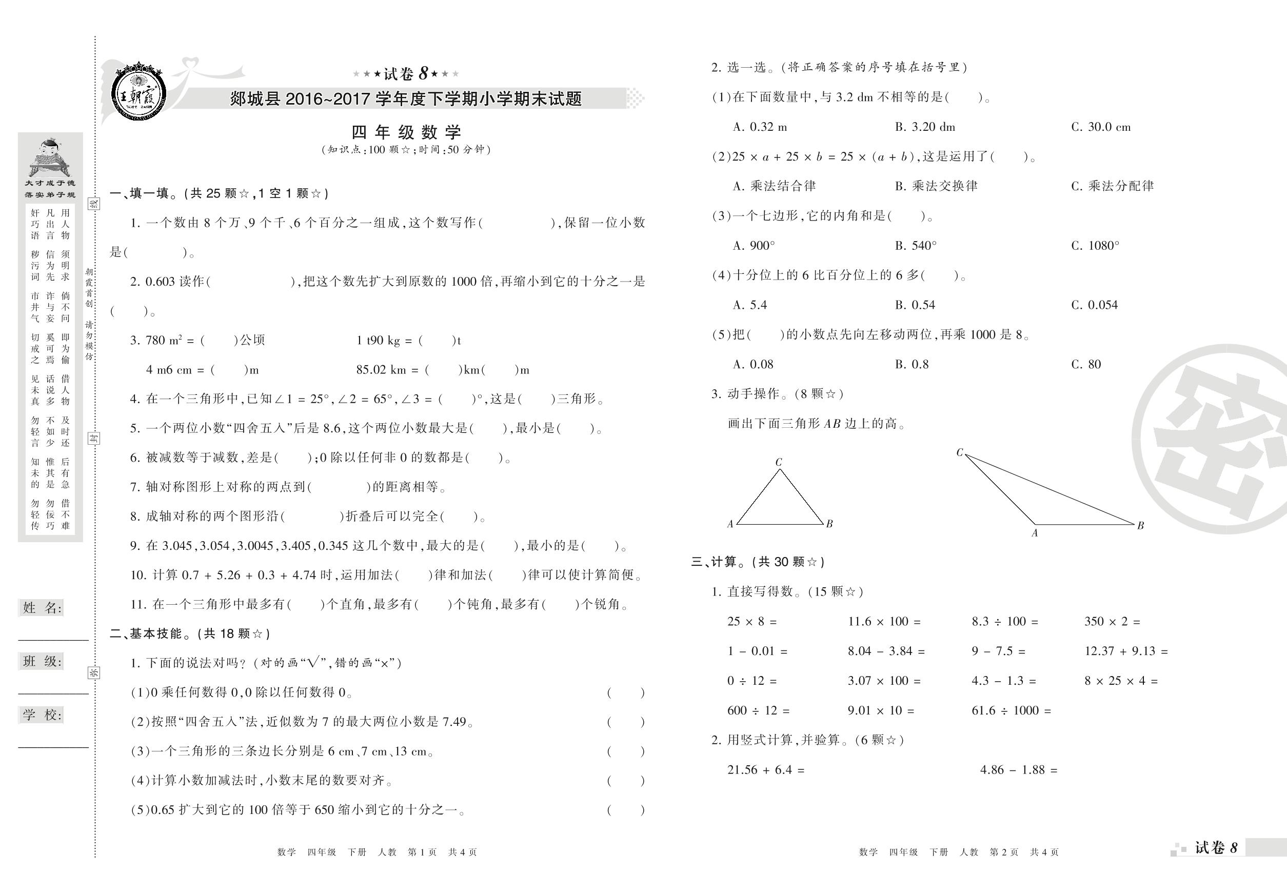 2016-2017学年第二学期临沂市郯城县四年级数学试卷(人教版)【8】