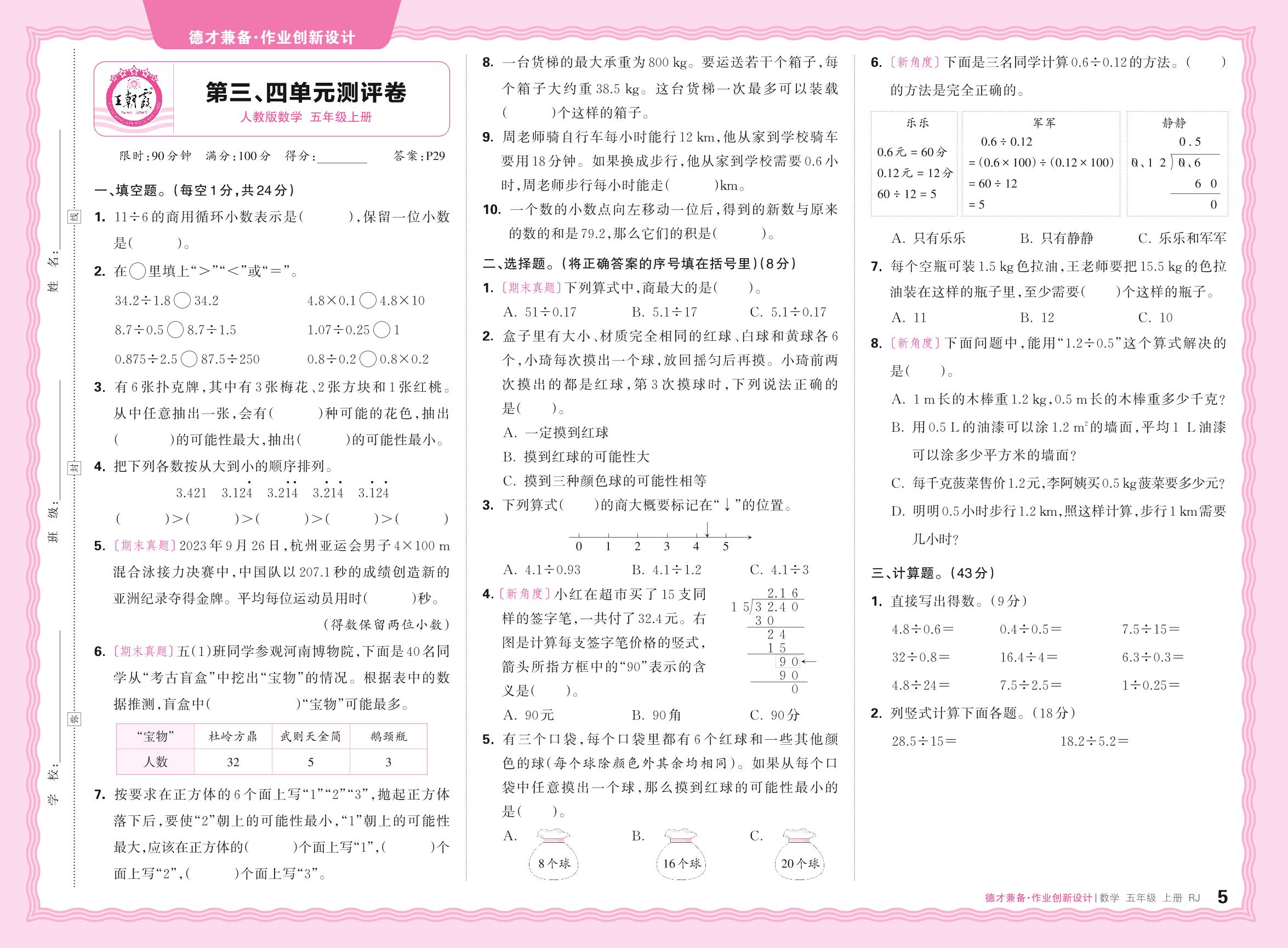 2024秋上册五年级数学人教版 第三、四单元测评卷