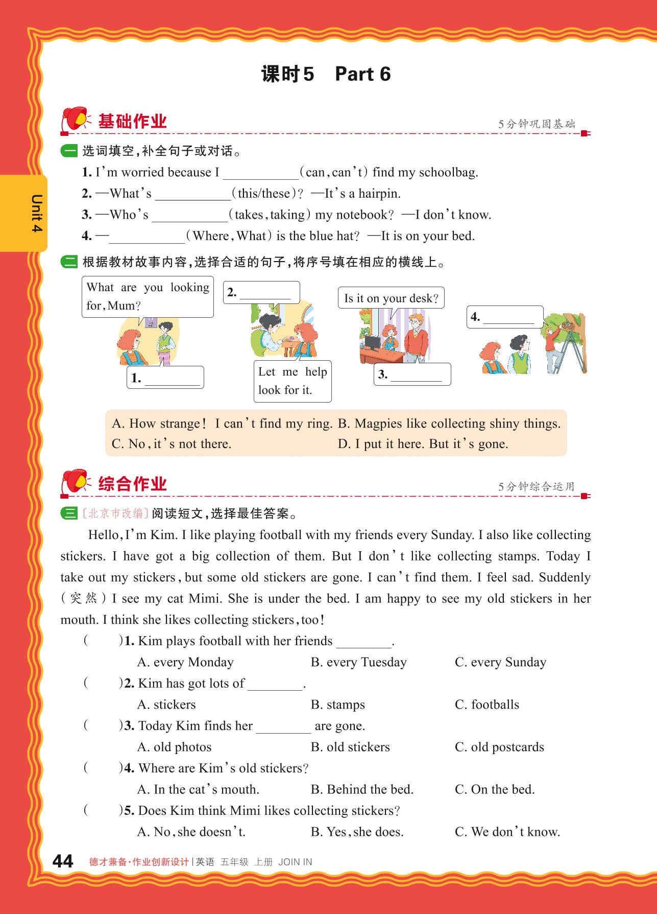 2024秋上册五年级英语剑桥版 Unit 4—课时 5 Part 6