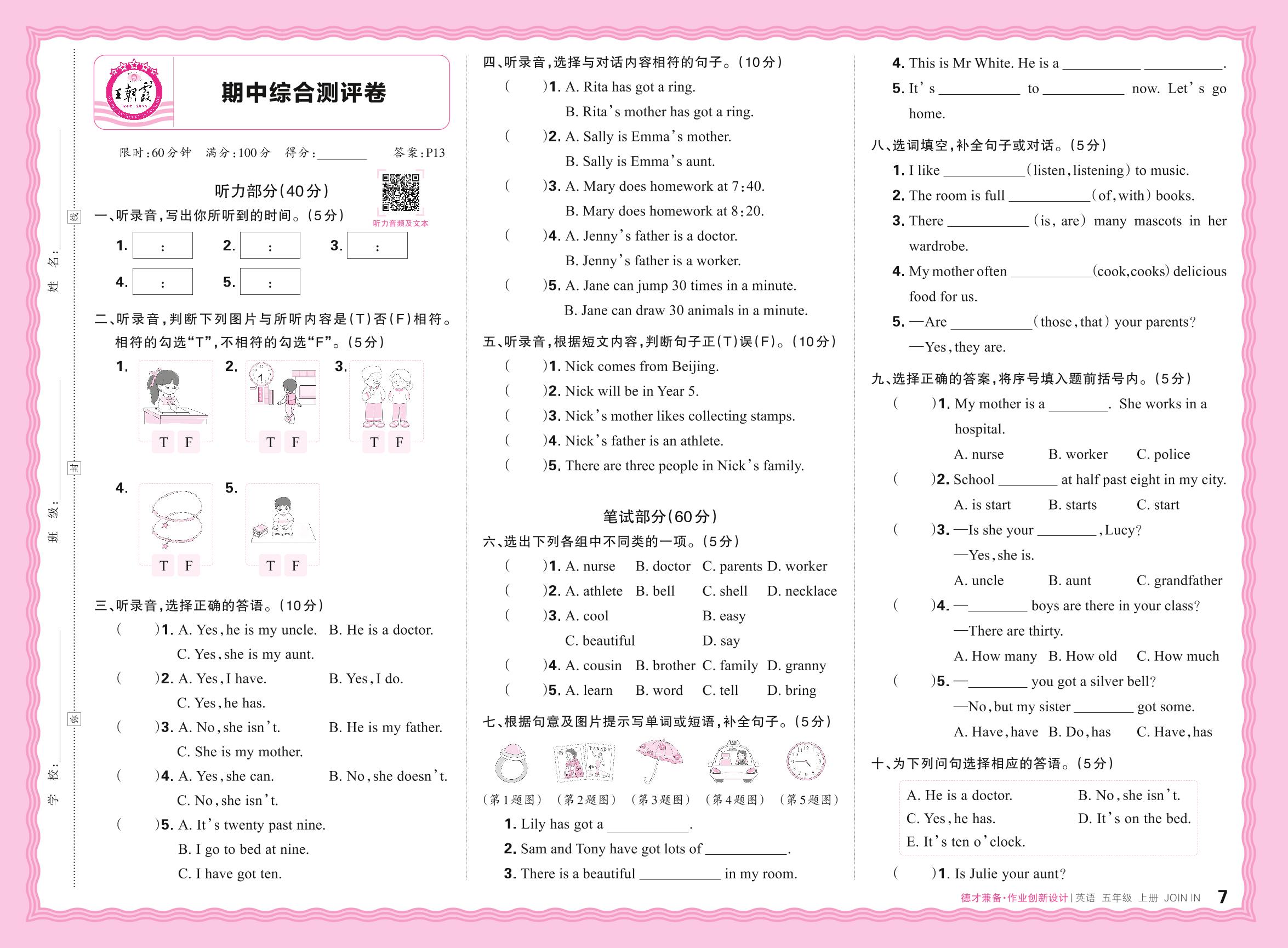 2024秋上册五年级英语剑桥版 期中综合测评卷
