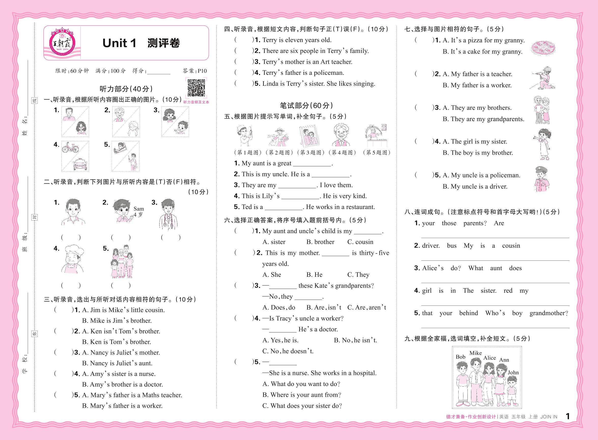 2024秋上册五年级英语剑桥版 Unit 1 测评卷