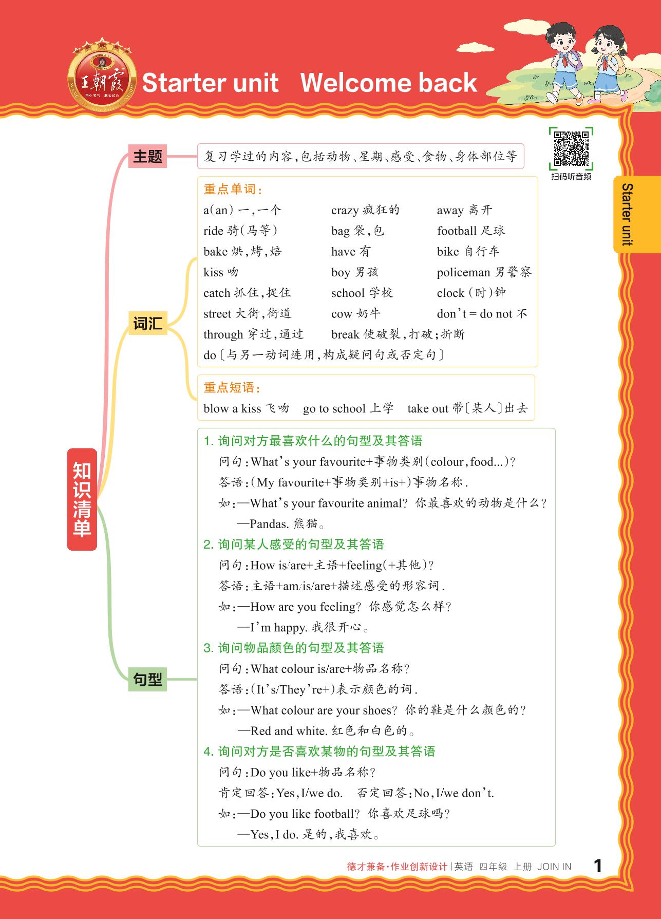 2024秋上册四年级英语剑桥版 Starter unit 知识清单