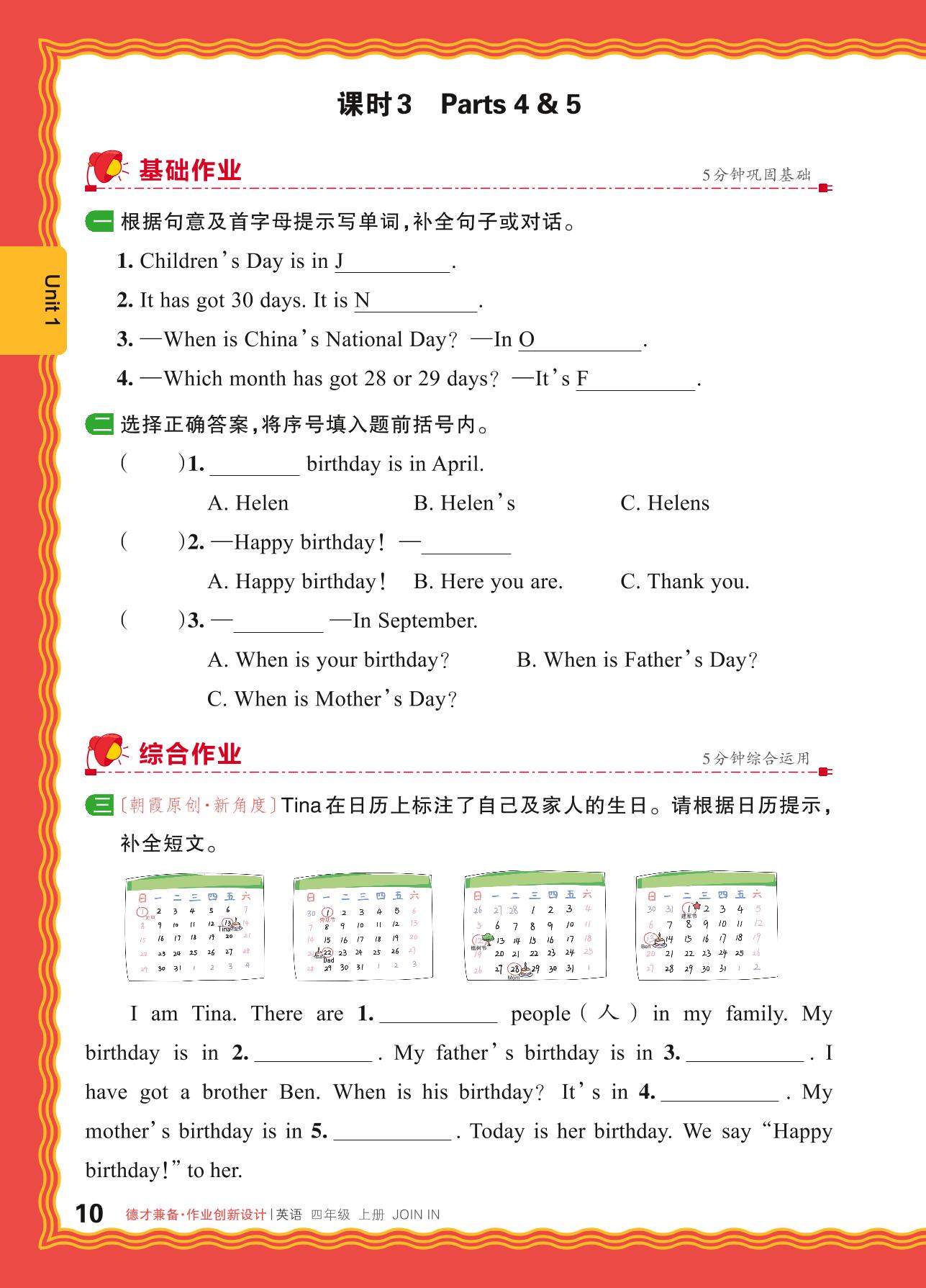 2024秋上册四年级英语剑桥版 Unit 1—课时3 Parts 4 & 5