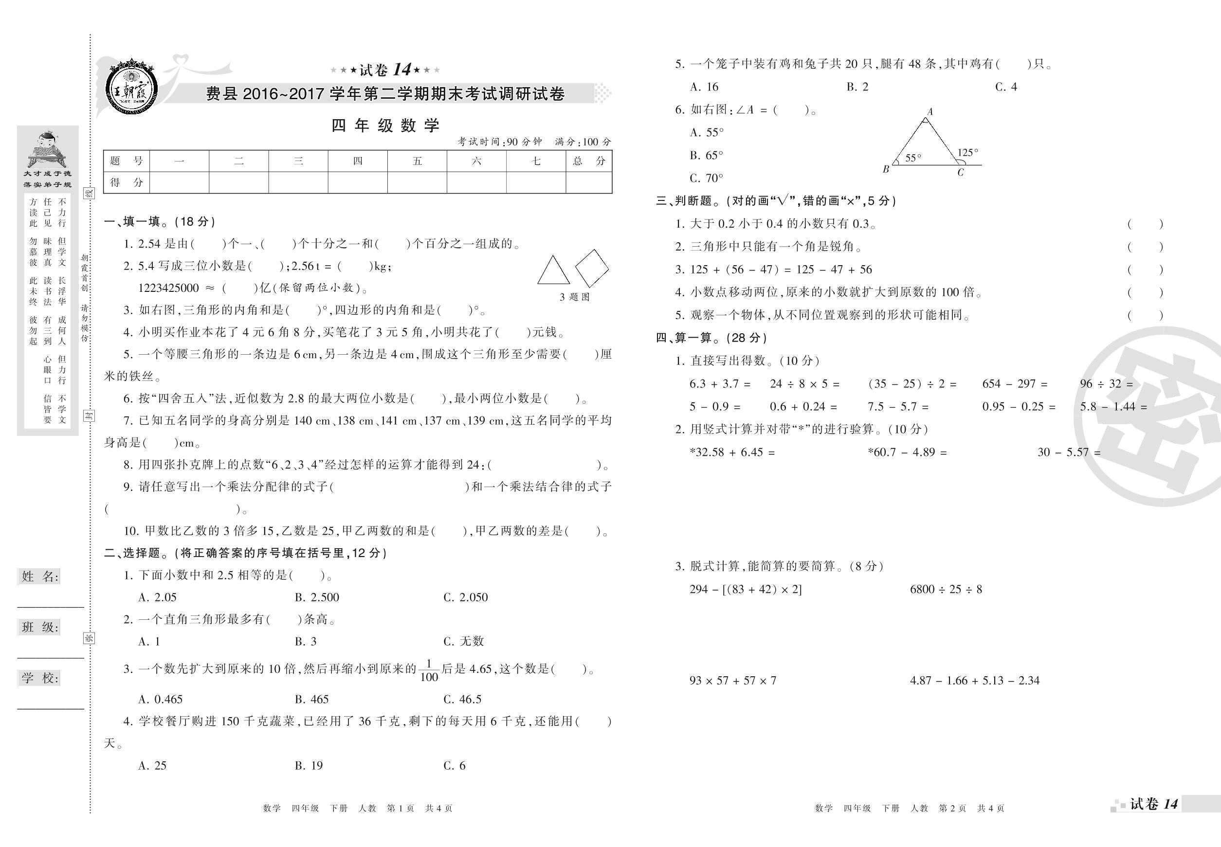 2016-2017学年第二学期临沂市费县四年级数学试卷(人教版)【14】