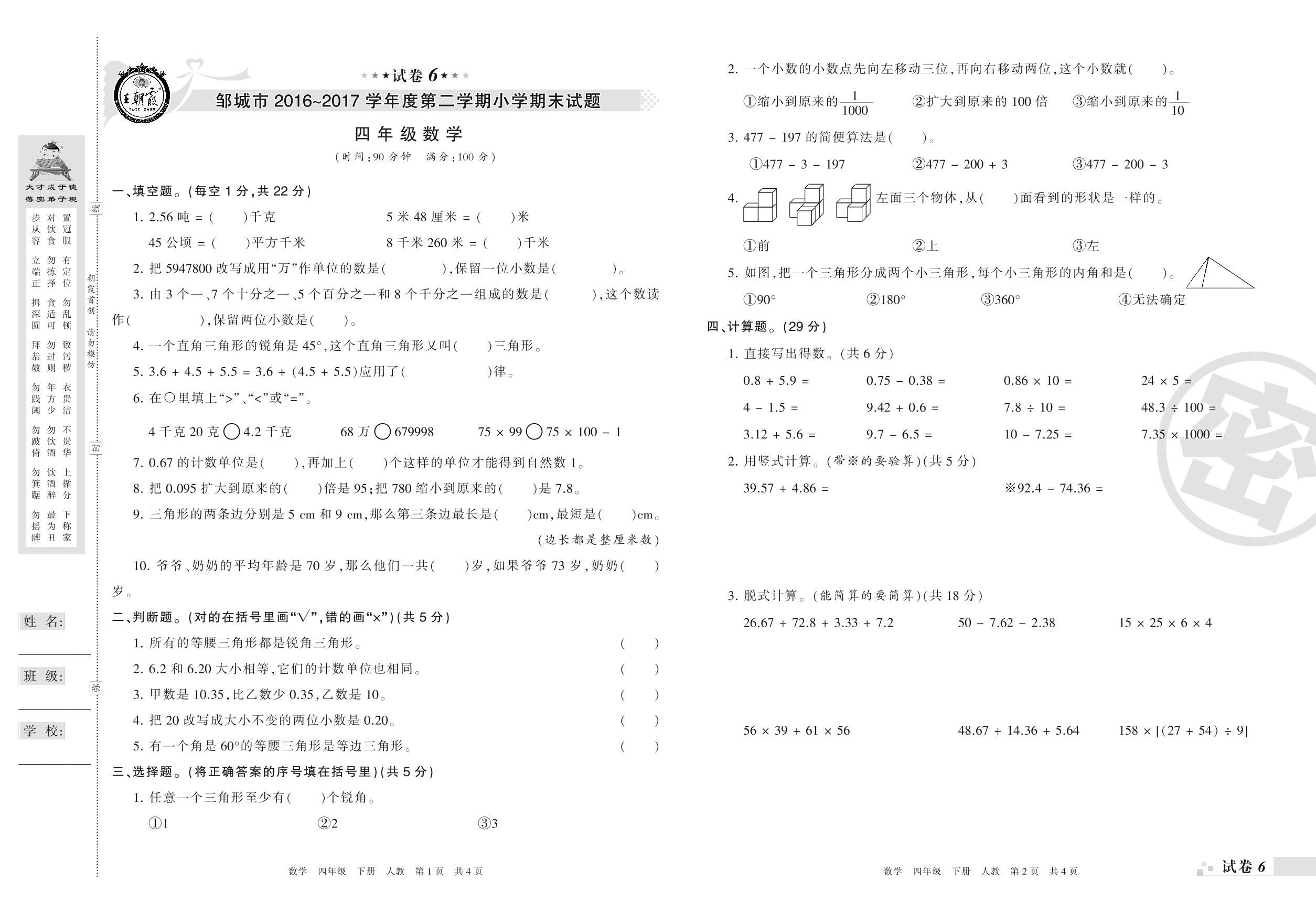 2016-2017学年第二学期邹城市四年级数学试卷(人教版)【6】