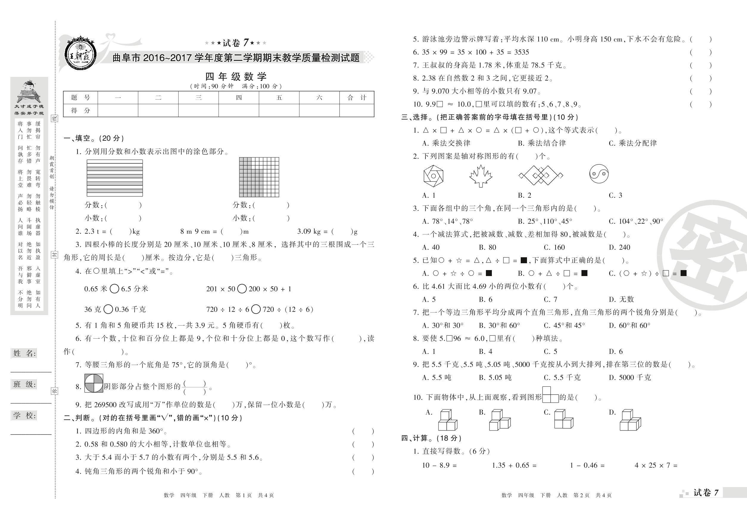 2016-2017学年第二学期曲阜市四年级数学试卷(人教版)【7】