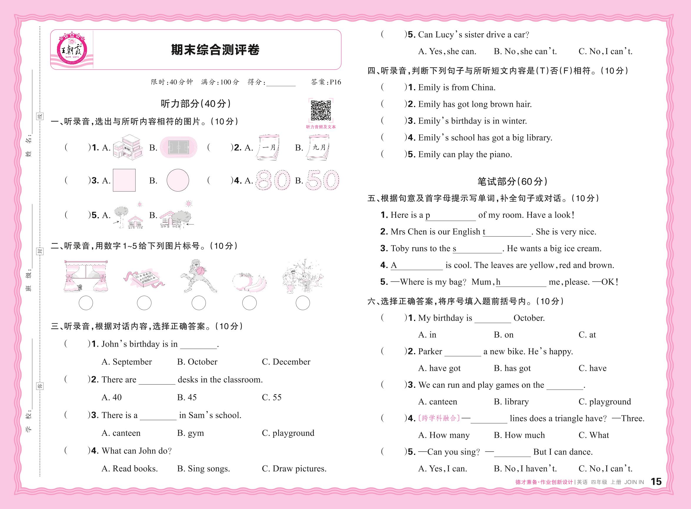 2024秋上册四年级英语剑桥版 期末综合测评卷