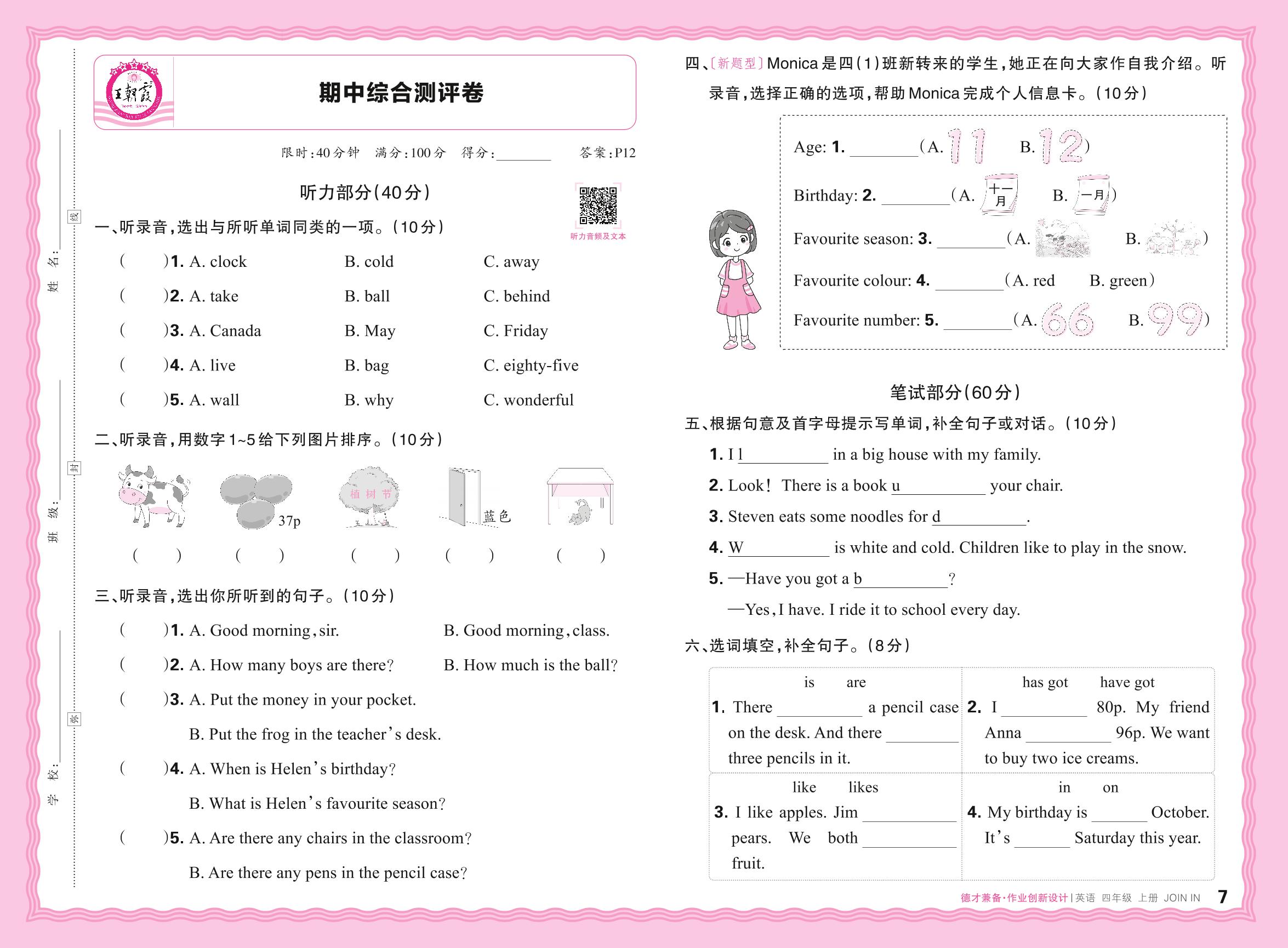 2024秋上册四年级英语剑桥版 期中综合测评卷