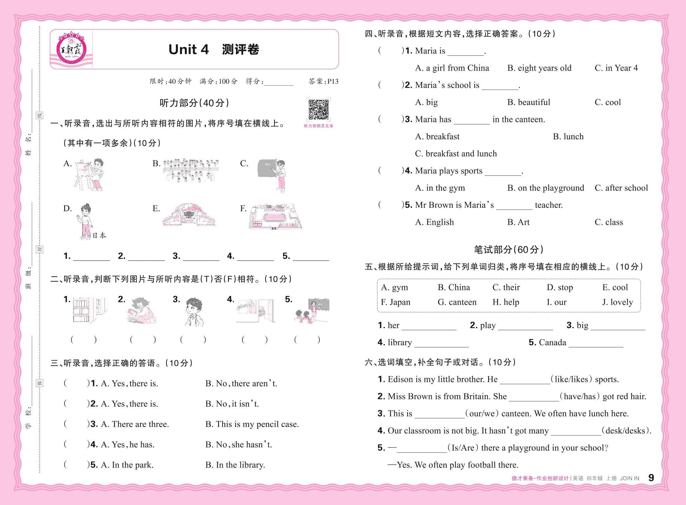 2024秋上册四年级英语剑桥版 Unit 4 测评卷
