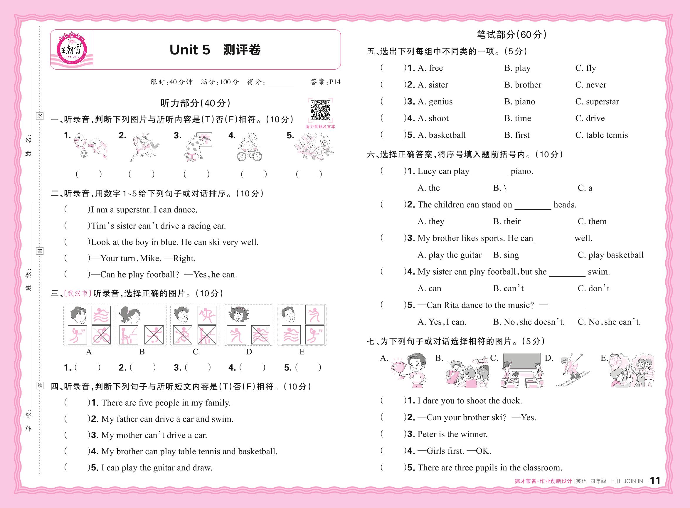 2024秋上册四年级英语剑桥版 Unit 5 测评卷