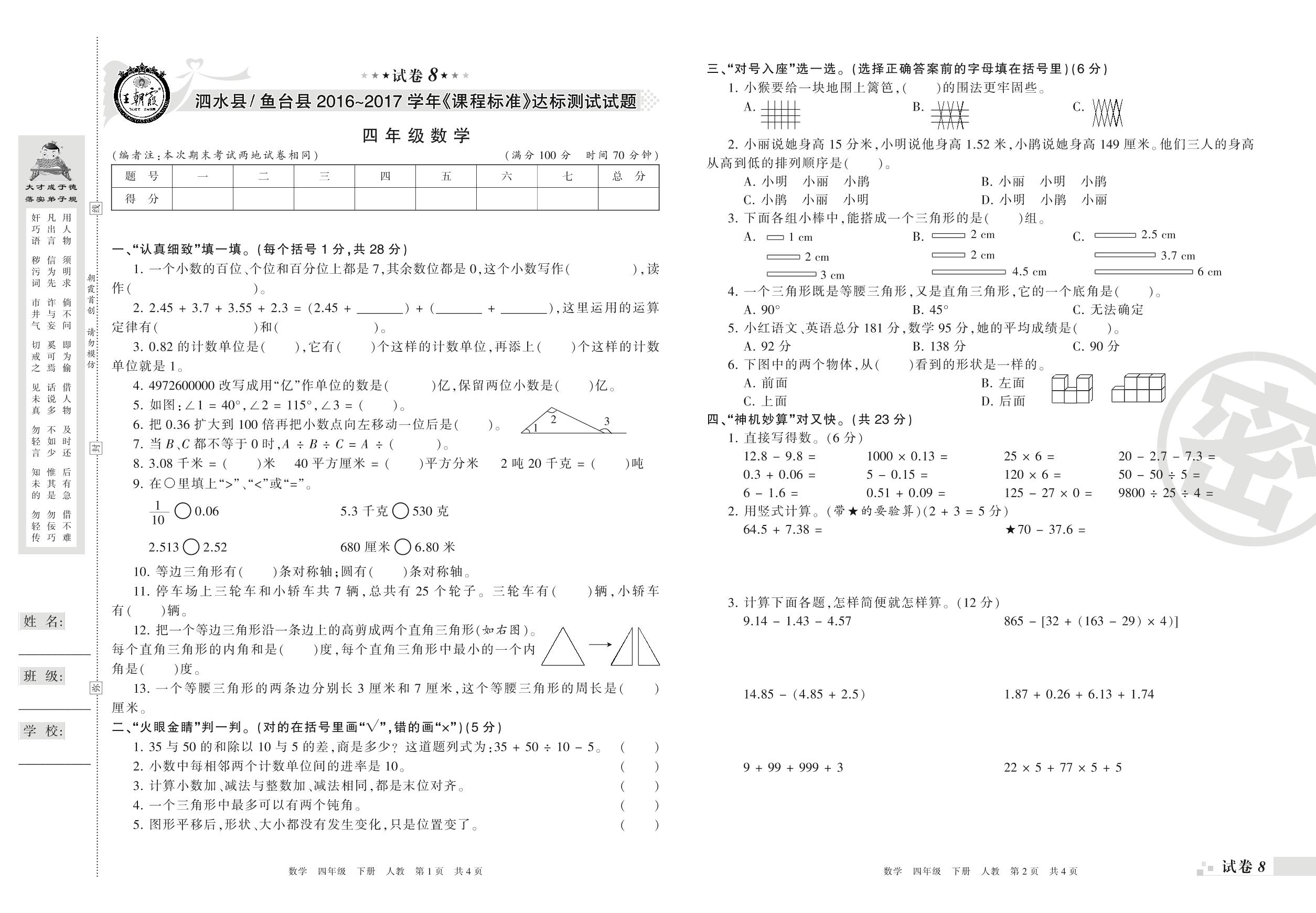 2016-2017学年第二学期济宁市泗水县(鱼台县)四年级数学试卷(人教版)【8】