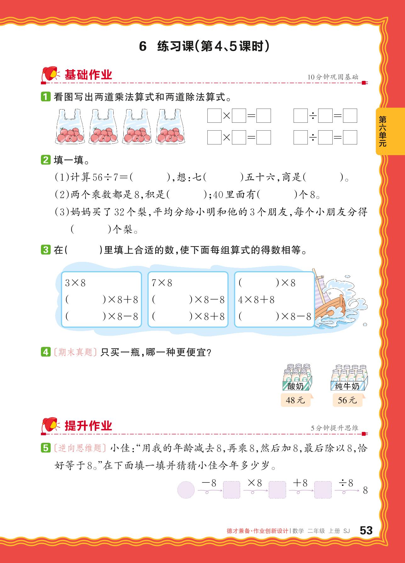 2024秋上册二年级数学苏教版 第六单元 表内乘法和表内除法(二)——6. 8的乘法口诀、用8的乘法口诀求商练习课