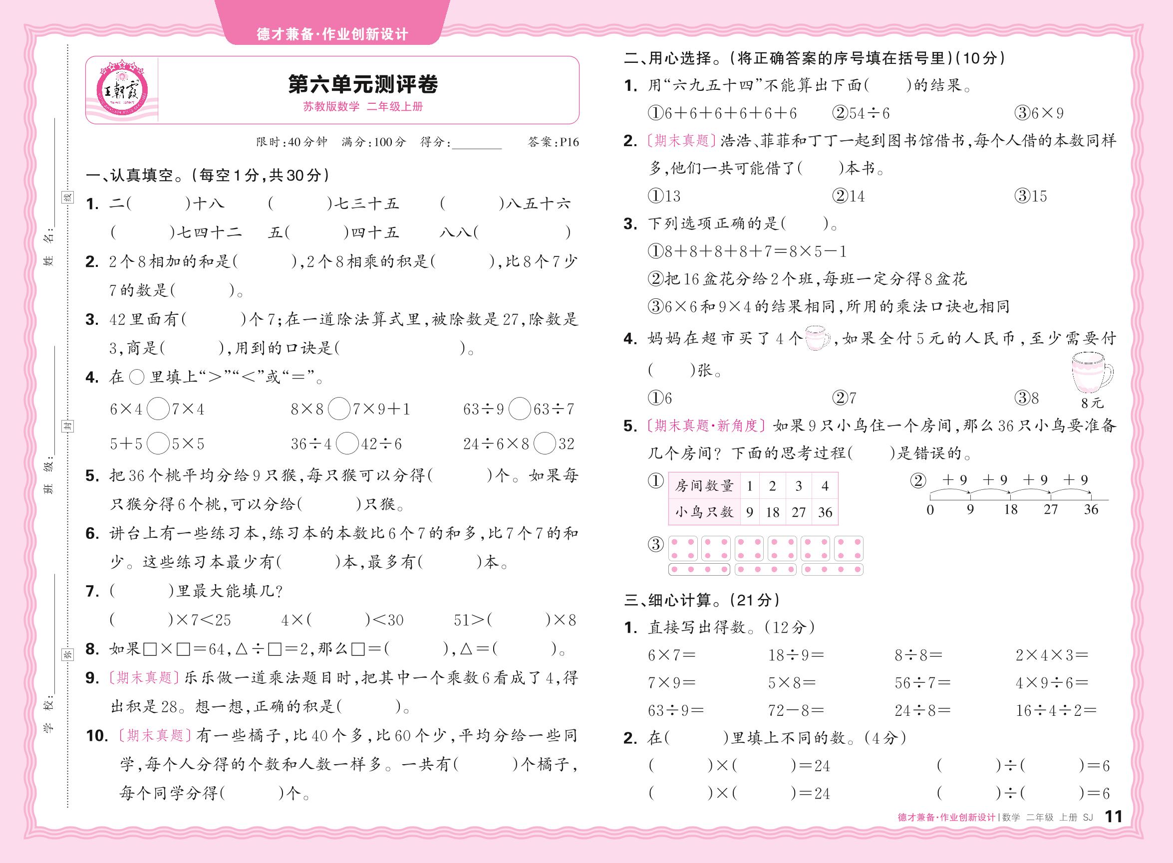 二年级数学苏教版上册单元卷